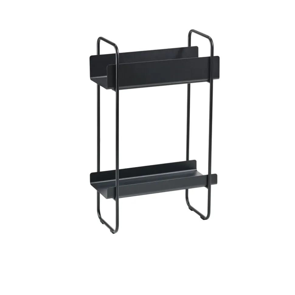 Forskøn et hjørne i stuen eller sig smukt velkommen i entreen. Det smalle konsolbord i pulverlakeret metal kan passe ind i de fleste rum, selv steder hvor gulvpladsen er sparsom. Det leveres med to hylder, som du selv kan placere efter behag og behov. Den ene hylde har høj kant, som kan holde på håndklæder, hue/handsker, hundesnore eller hvad end du har brug for.