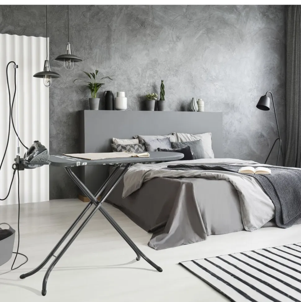 Airboard M Plus er betydeligt lettere end mange andre strygebrætter og udstyret med en unik strygeoverflade. Strygeoverfladen på 120 x 38 cm hviler på en stabil ramme, og arbejdshøjden kan justeres mellem 78 og 98 cm. Det specielle betræk med Thermo Reflect-teknologi reflekterer damp og varme fra strygejernet i stedet for at lade det fordampe gennem strygefladen. Takket være den tosidede strygeeffekt stryges tøjet på begge sider på samme tid. Airboard M Plus er både nemt at stille op og folde sammen igen. Strygebrættet er desuden udstyret med en fast strygejernsstøtte, en stikkontakt og en kabelholder, så ledningen ikke er i vejen for strygningen. 5 års garanti.