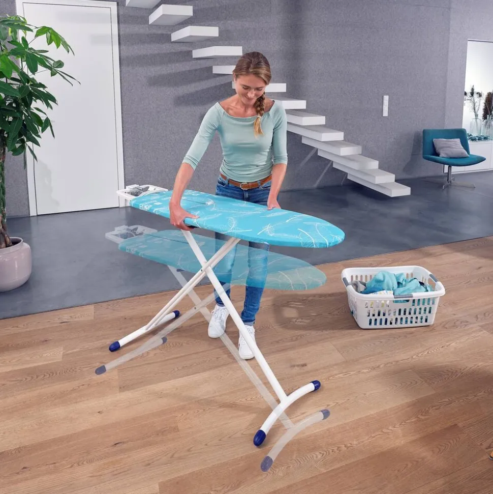 Strygeoverfladen er lavet af ultralet plast og hviler på et metalstativ af 35 mm tykke rør. Selv om strygebrættet er meget let, er det yderst stabilt og alligevel så fleksibelt , at stativet kan tilpasse sig til ujævne gulve. Det er nemt at stille op og folde sammen.