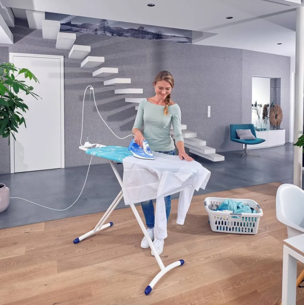 Designet til brug med både standard- og dampstrygejern og forsynet med fast metalholder til strygejernet, stikkontakt og kabelholder, der forhindrer, at ledningen er i vejen under strygningen.
