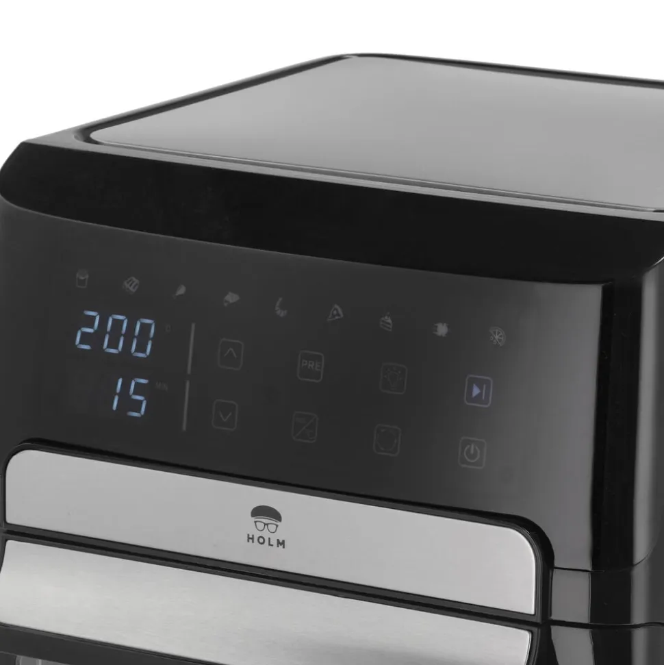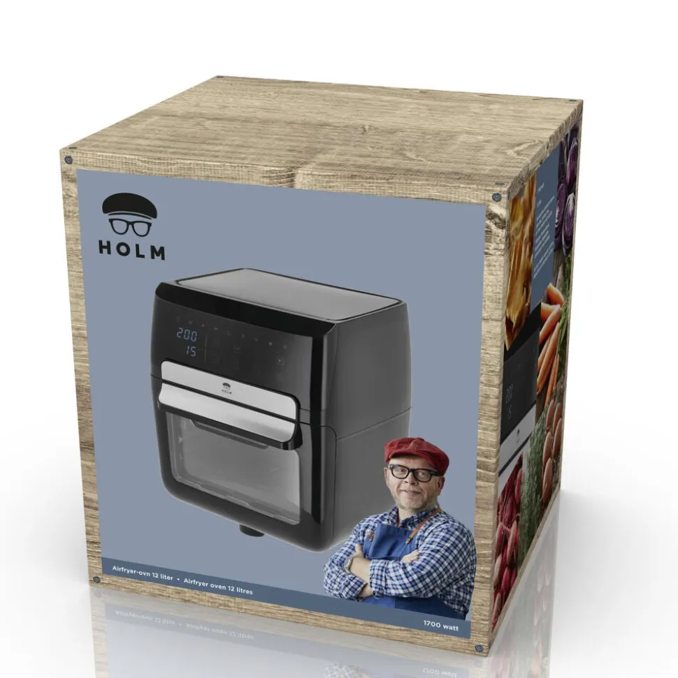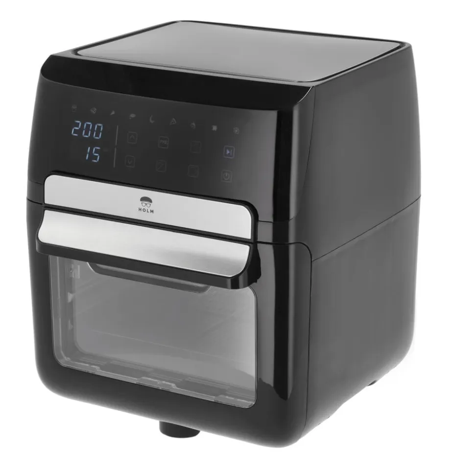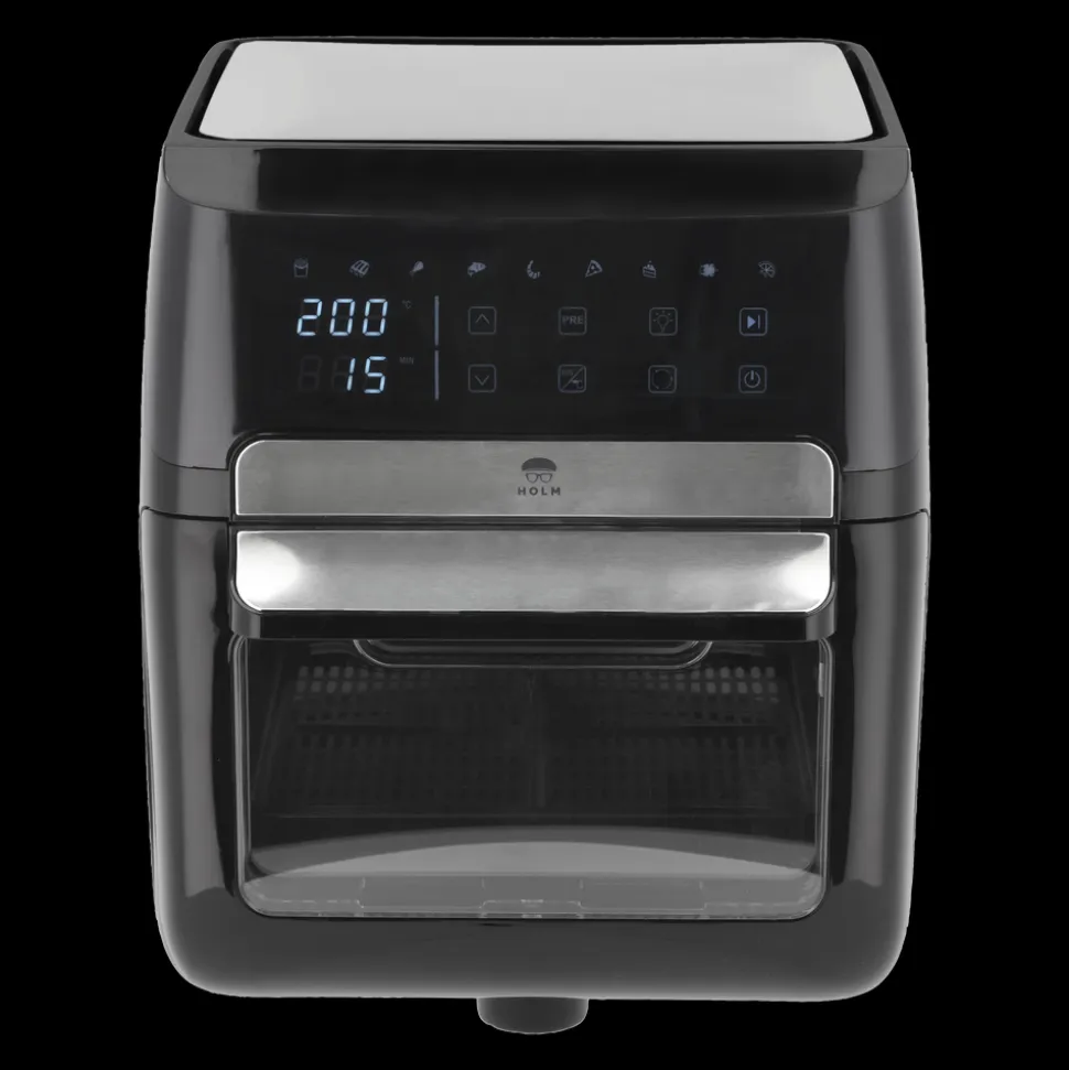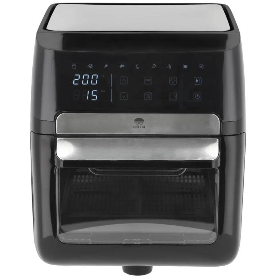 Airfryer-ovn 12 liter. I en airfryer tilberedes maden med cirkulerende varm luft i stedet for fritureolie, og fritterne får sprød og crispy overflade helt uden eller med meget små mængder olie.