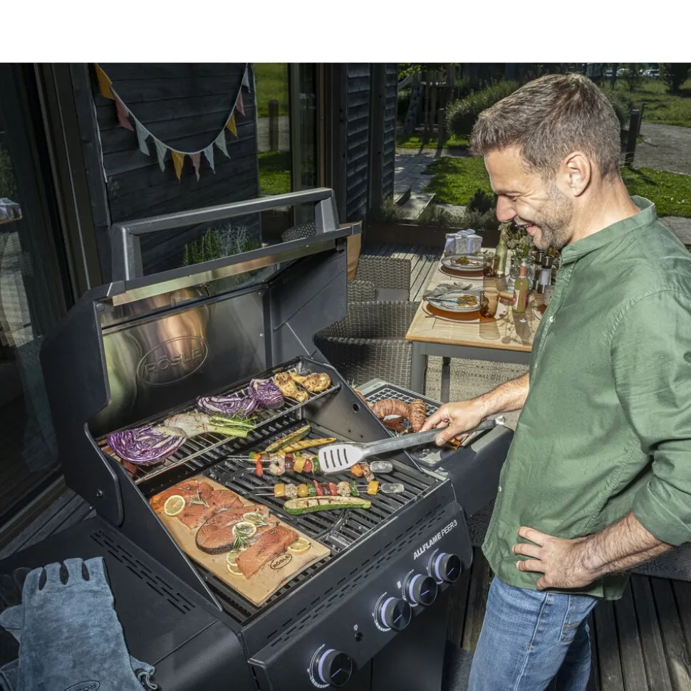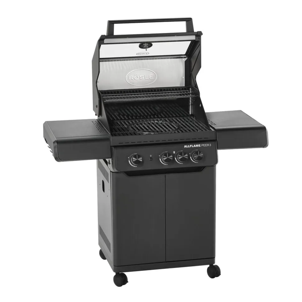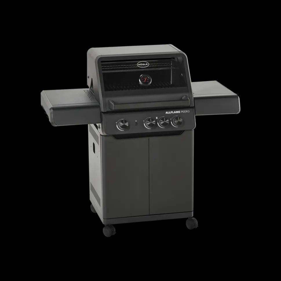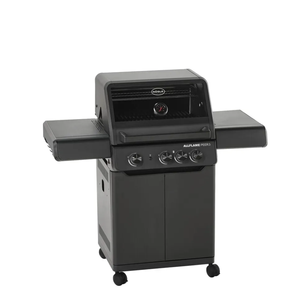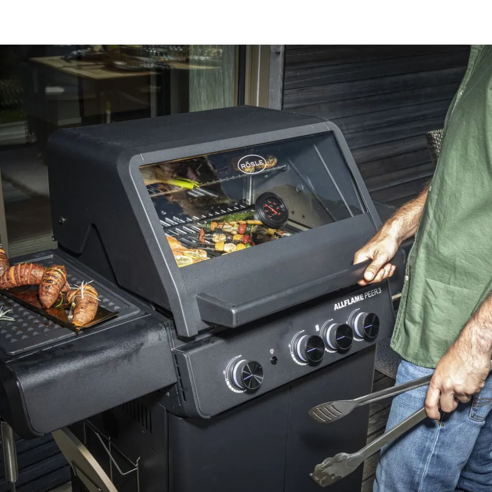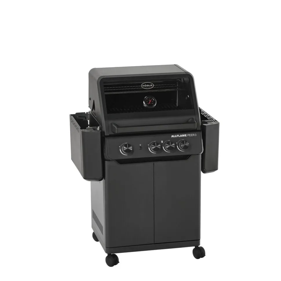 Der fås cover (varenr. 23916), rotisseri (varenr. 36098) og grillplade (varenr. 35569) til Rösle AllFlame Peer 3 gasgrill, som kan tilkøbes separat.