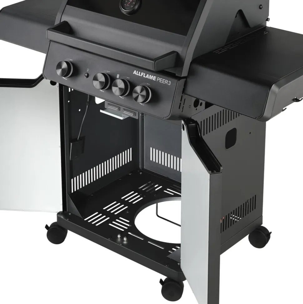 Rösle AllFlame Peer 3 er en solid gasgrill med 3 effektive heatspire-hovedbrændere i rustfrit stål (hver 3,5 kW), som sikrer hurtig opvarmning og en meget jævn varmefordeling. Grillen har også en integreret crispzone (3 kW) i grillarealet, som kan nå temperaturer på op til 450 °C – perfekt til sprøde stegeskorper. Med en rummelig grillflade på 60 x 45 cm og en varmehylde på 60 x 16 cm er der masser af plads til tilberedning. De emaljerede støbejernsriste sikrer de klassiske grillstriber på kødet. Det smarte Vario+ grillsystem gør det nemt at tilberede forskellige retter. Grillens runde rist kan nemt skiftes ud med en pizzasten (23937), grillplade (24145), gryde (24404) eller wok (24143), som placeres tæt på varmen og hurtigt bliver meget varm. Vario-tilbehør sælges separat. Grillen har sammenklappelige sideborde, så du får ekstra arbejdsplads, når du har brug for det. Pulverlakeret stålkabinet beskytter mod vind og vejr, og der er plads til en gasflaske på op til 11 kg.