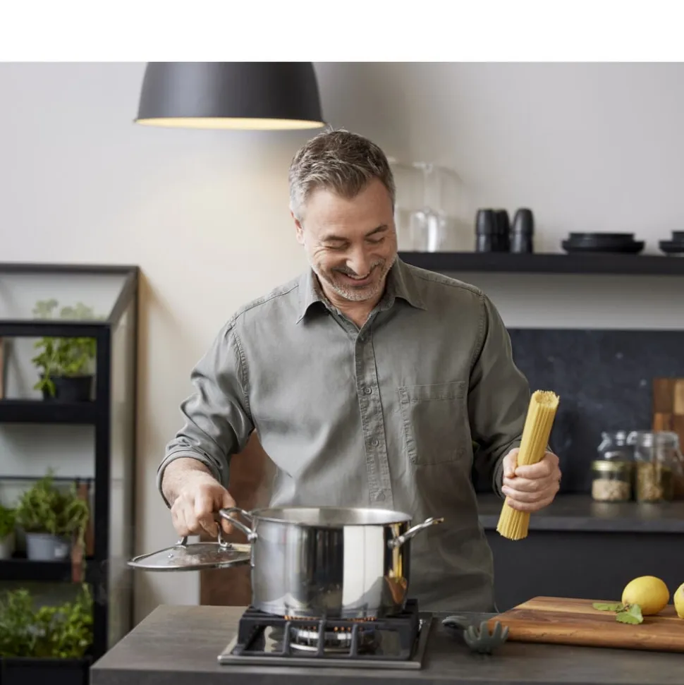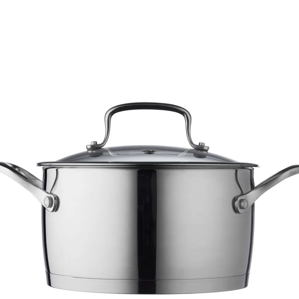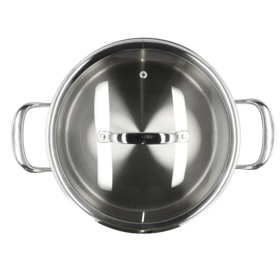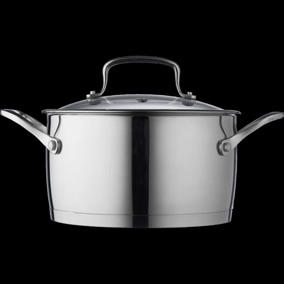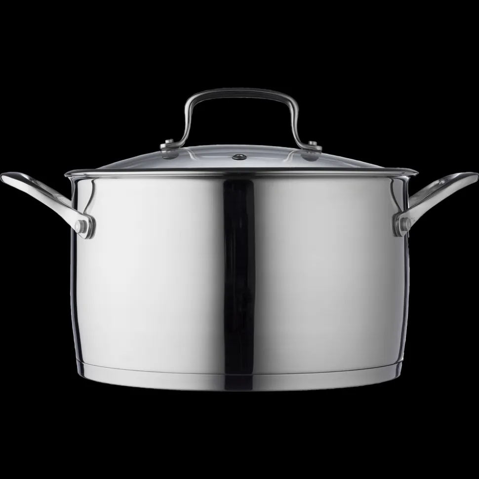 Gryde fremstillet i satinpoleret rustfrit stål. Bunden har en aluminiumkerne, som sikrer, at varmen fordeles jævnt og effektivt. Gryden er velegnet til alle varmekilder, tåler op til 220 grader C i ovnen og kan gå i opvaskemaskinen. Gryden tåler alle typer redskaber, har tilhørende glaslåg og kan indeholde 6,2 liter.