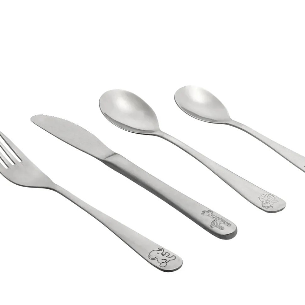 Børnebestik i blankt rustfrit stål med indgraverede dyr på skafterne.