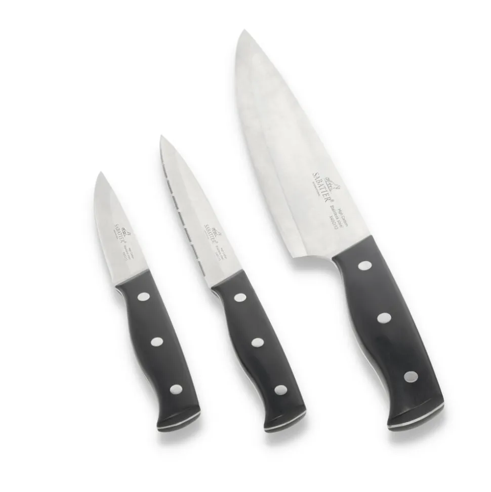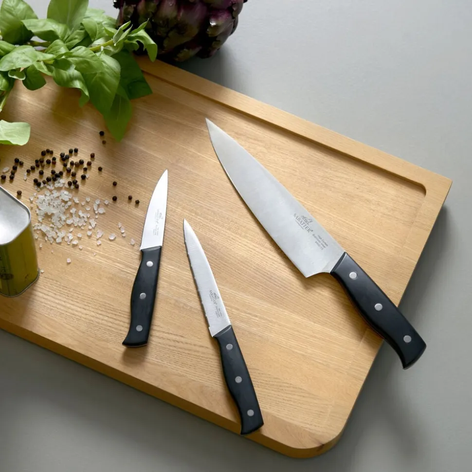 Lion Sabatier Austral er knive af rustfrit stål med skafter af sort ABS-plast. Urtekniv 9 cm, tomatkniv 13 cm, kokkekniv 20 cm.