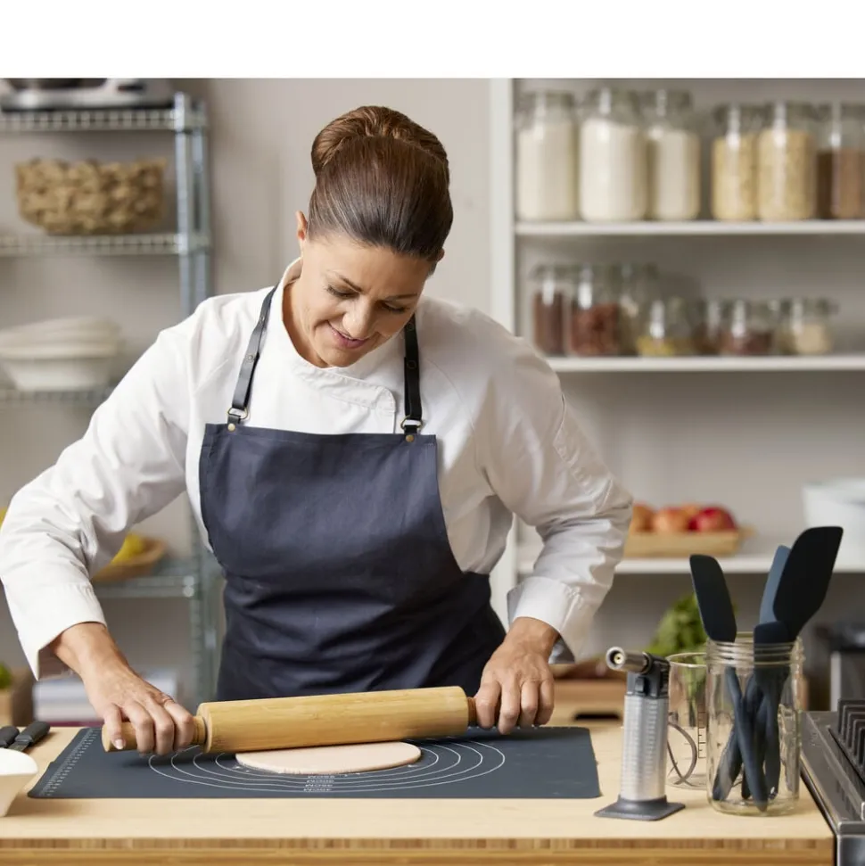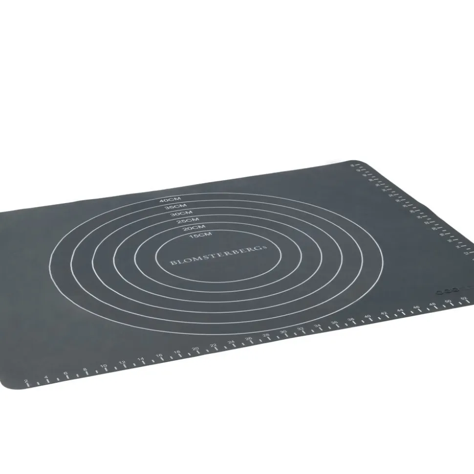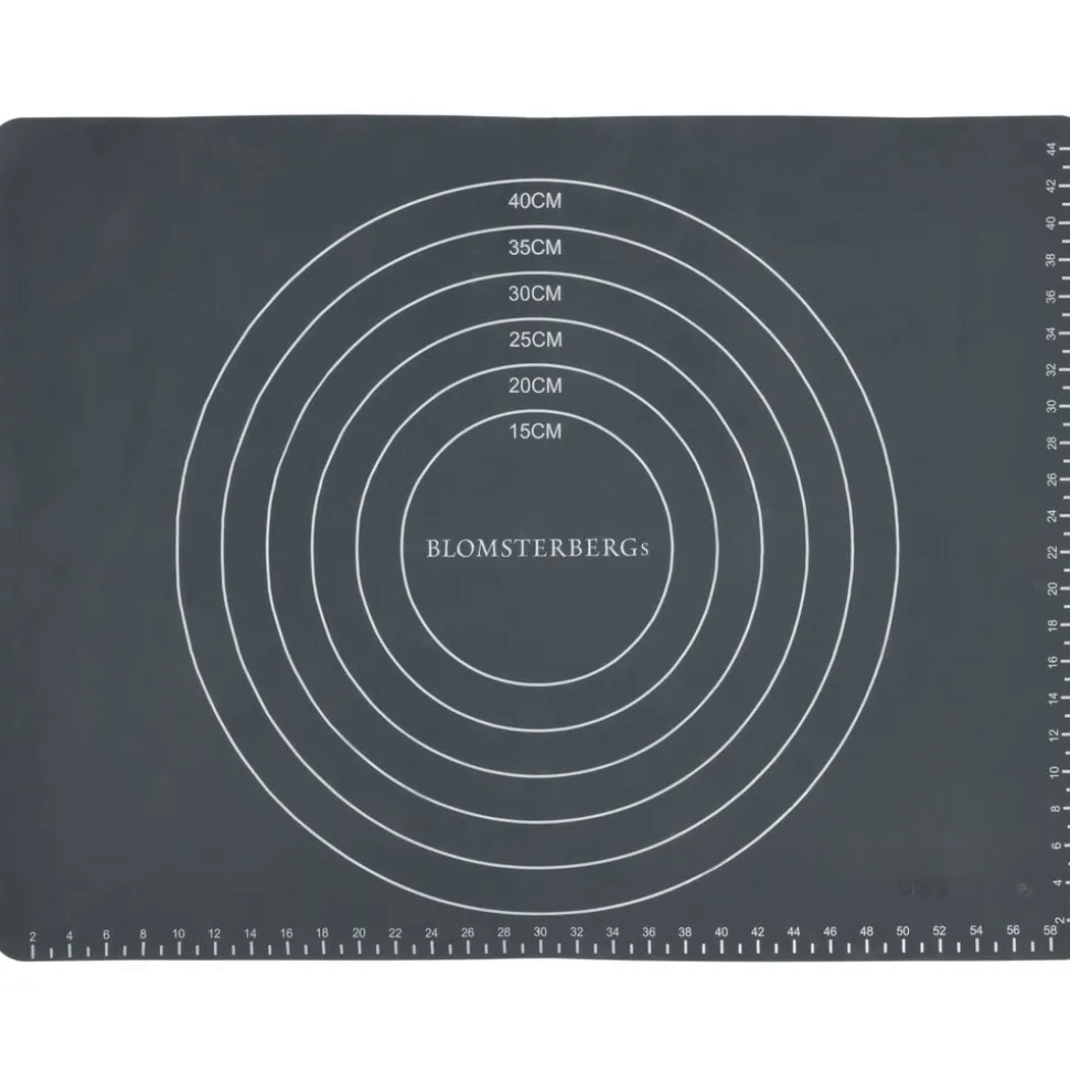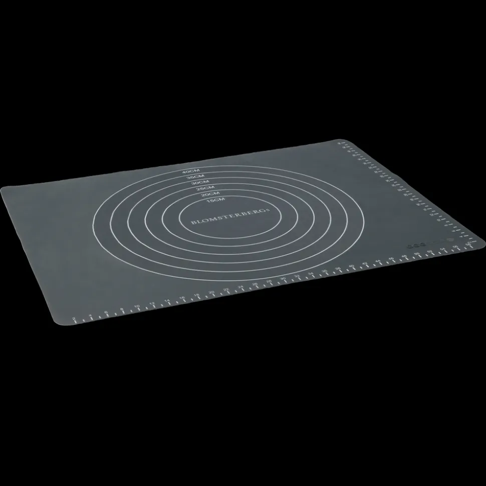 Genbrugeligt bageunderlag med mål fremstillet i grå silikone. Anvendes som underlag ved æltning og udrulning af fx mørdej, pizzadej, fondant, marcipan eller lign. Fungerer også godt som bolsjemåtte. Praktiske mål til hjælp ved udrulning af præcise udskæringer. Bageunderlaget er skridsikkert og let at tørre af efter brug.