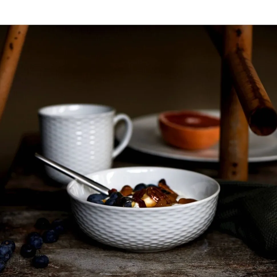 Porcelænsserien Basket er sprødt, hvidt porcelæn med en elegant dekoration, udført som en subtil, detaljeret vævning, inspireret af klassisk kurveflet. Basket puster liv i din daglige borddækning og er samtidig elegant nok til livets særlige lejligheder.
