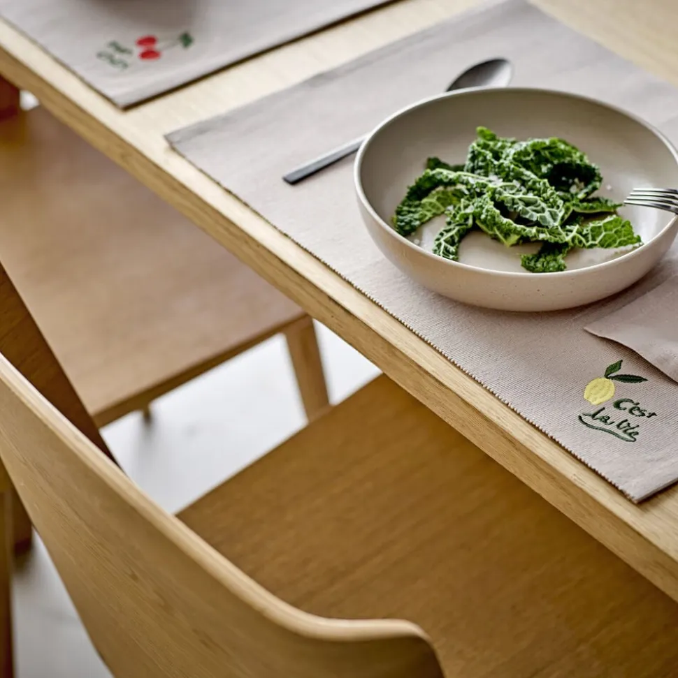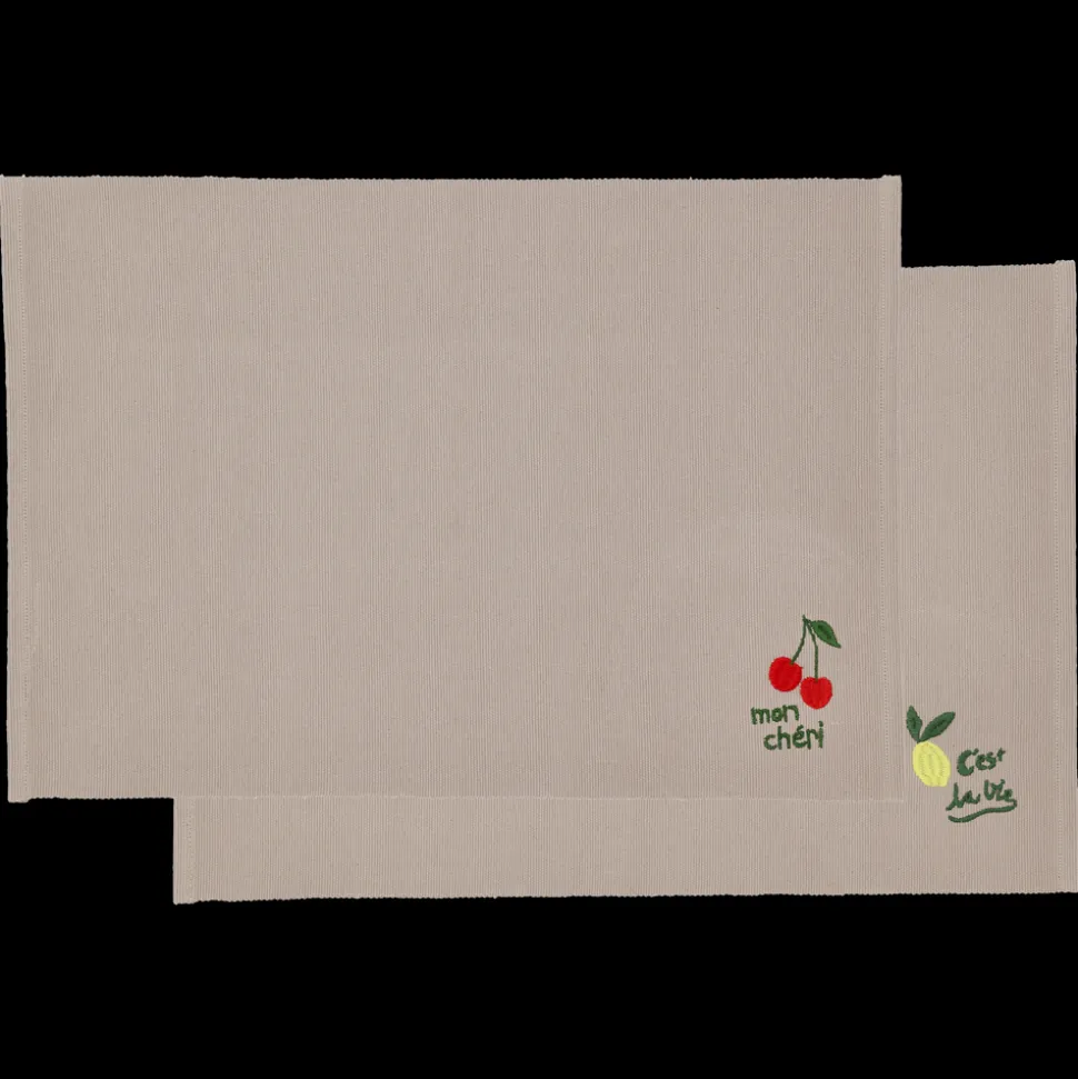 Dækkeservietterne har skønne broderier inspireret af klassiske café-motiver: kirsebær, citroner, kaffekopper og croissanter. Broderierne er farverige, og den neutrale farve i dækkeservietten skaber den perfekte baggrund, der lader de fine design træde frem.