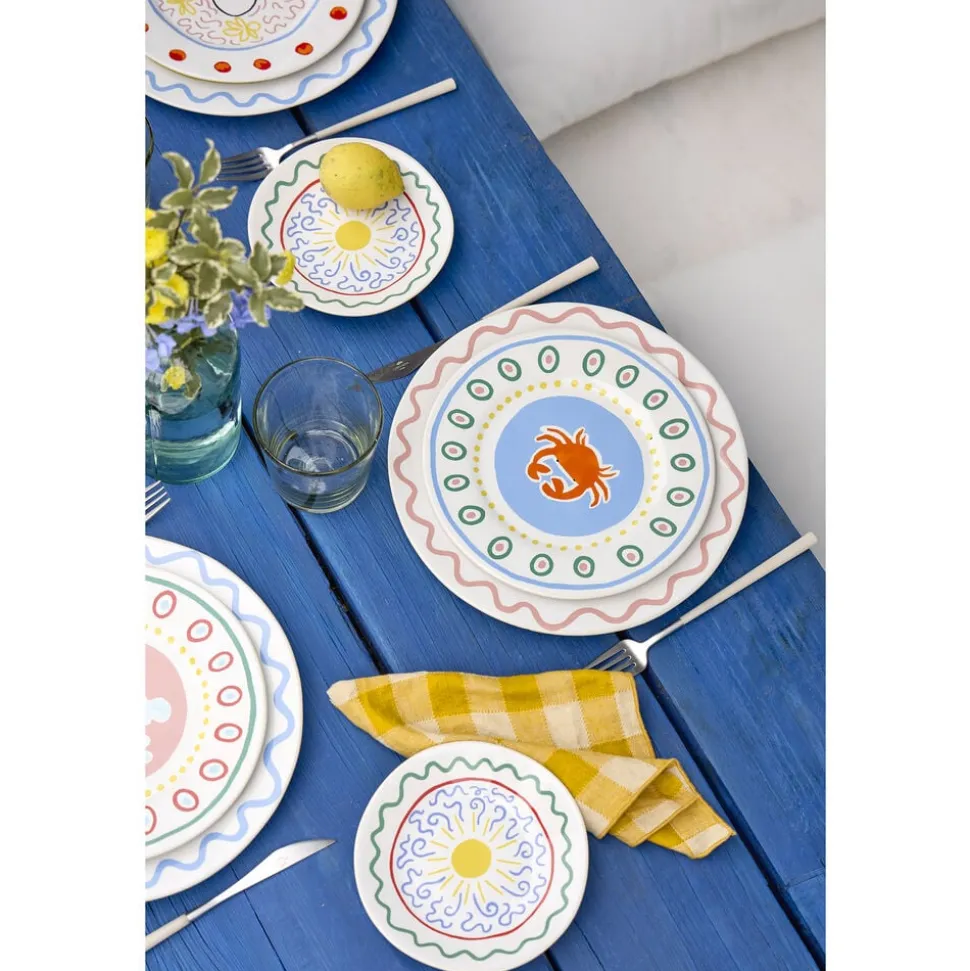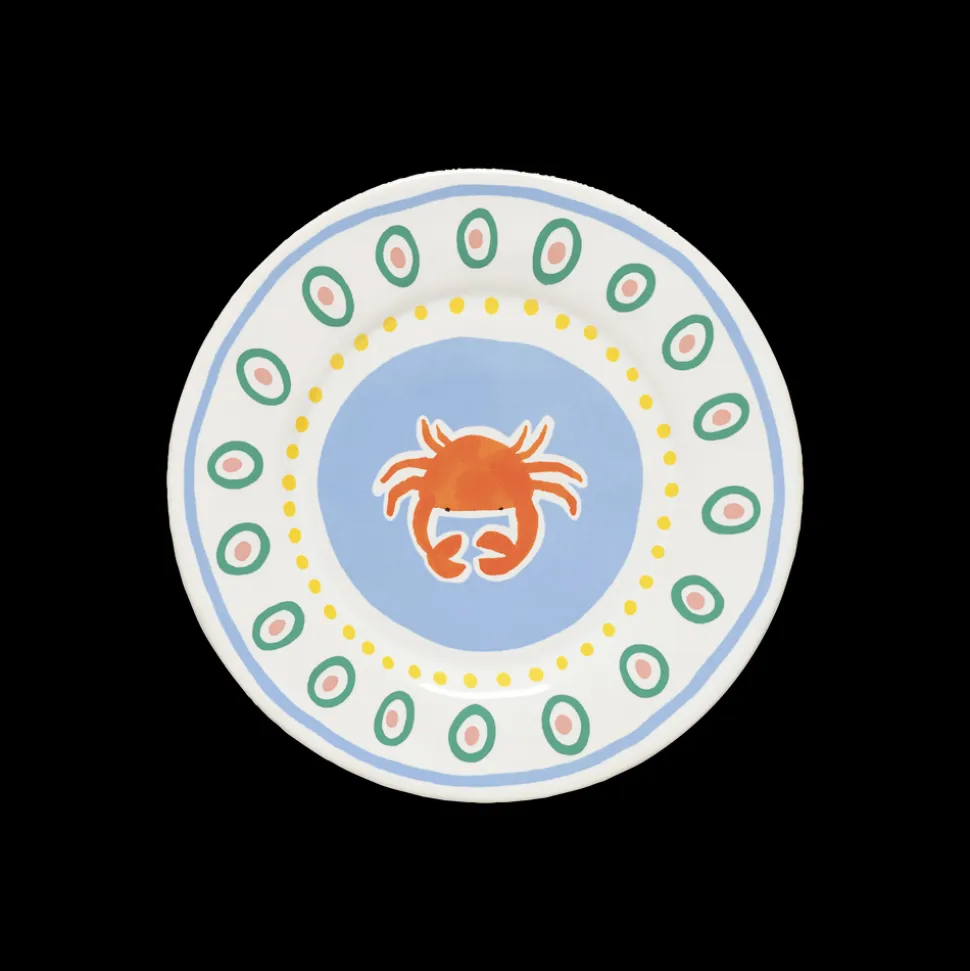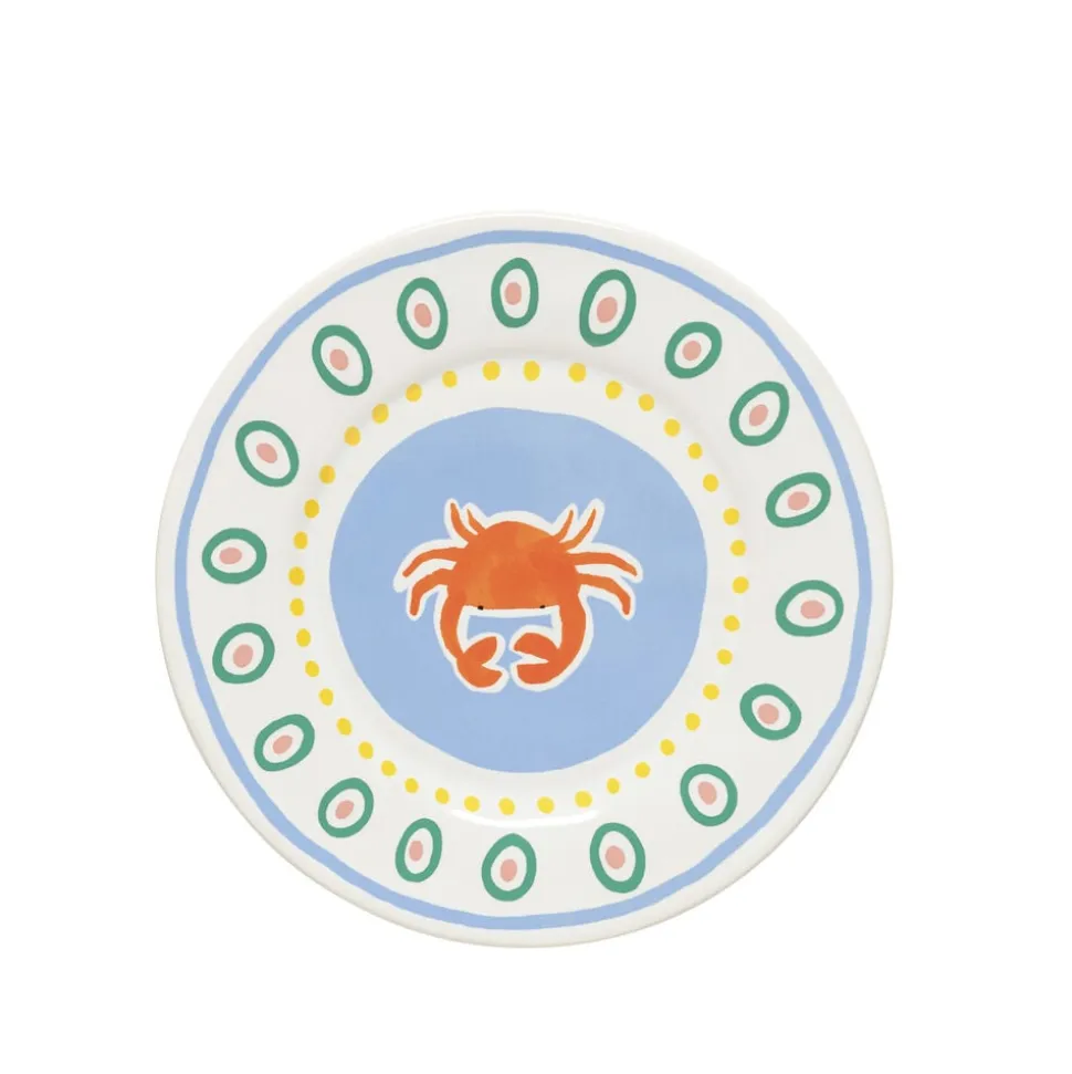 Tallerken, 22 cm. Tallerkenen lyser op med sin røde krabbe, som står i smuk kontrast til den lyseblå baggrund, og skaber en afslappet middelhavsstemning ved bordet. Perfekt til små serveringer, en frisk skaldyrsplatte eller en farverig morgenmad i solen.