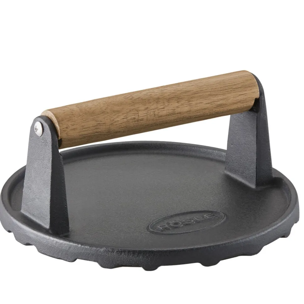 Emaljeret bøfvægt af støbejern med mørkt træhåndtag. Vægten opvarmes på grillen og lægges på den mad, der skal tilberedes, når den er varm. Ideel til grillning af burgere, bøffer og mad, der skal tilberedes i en kort periode.