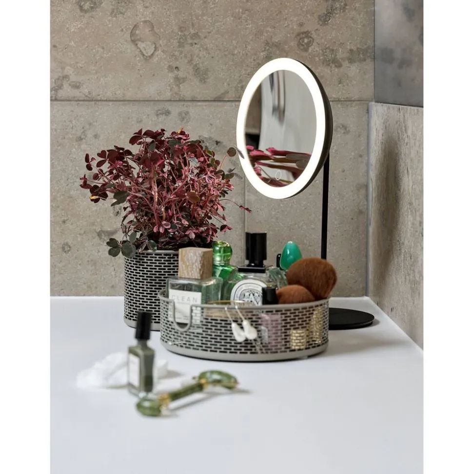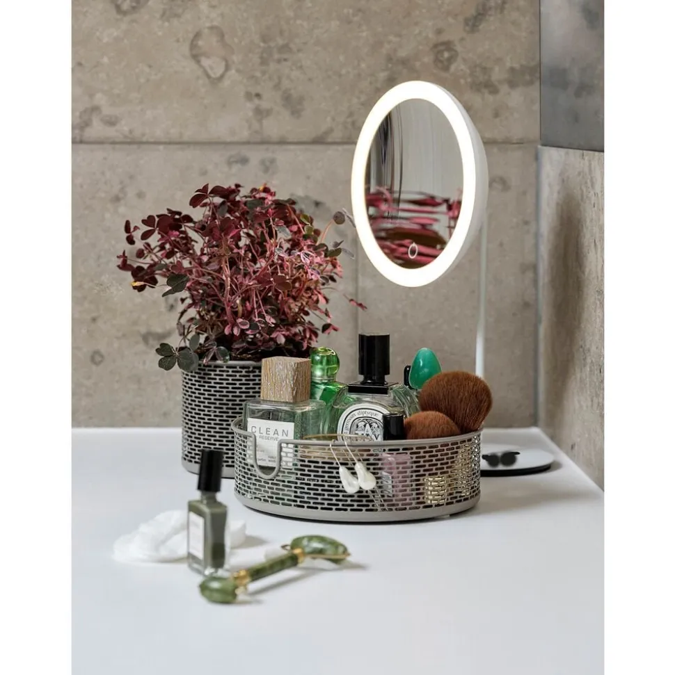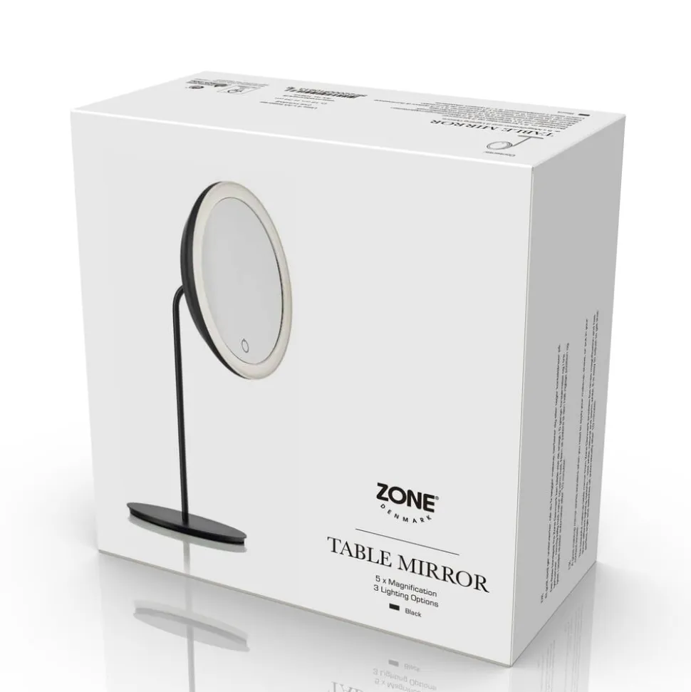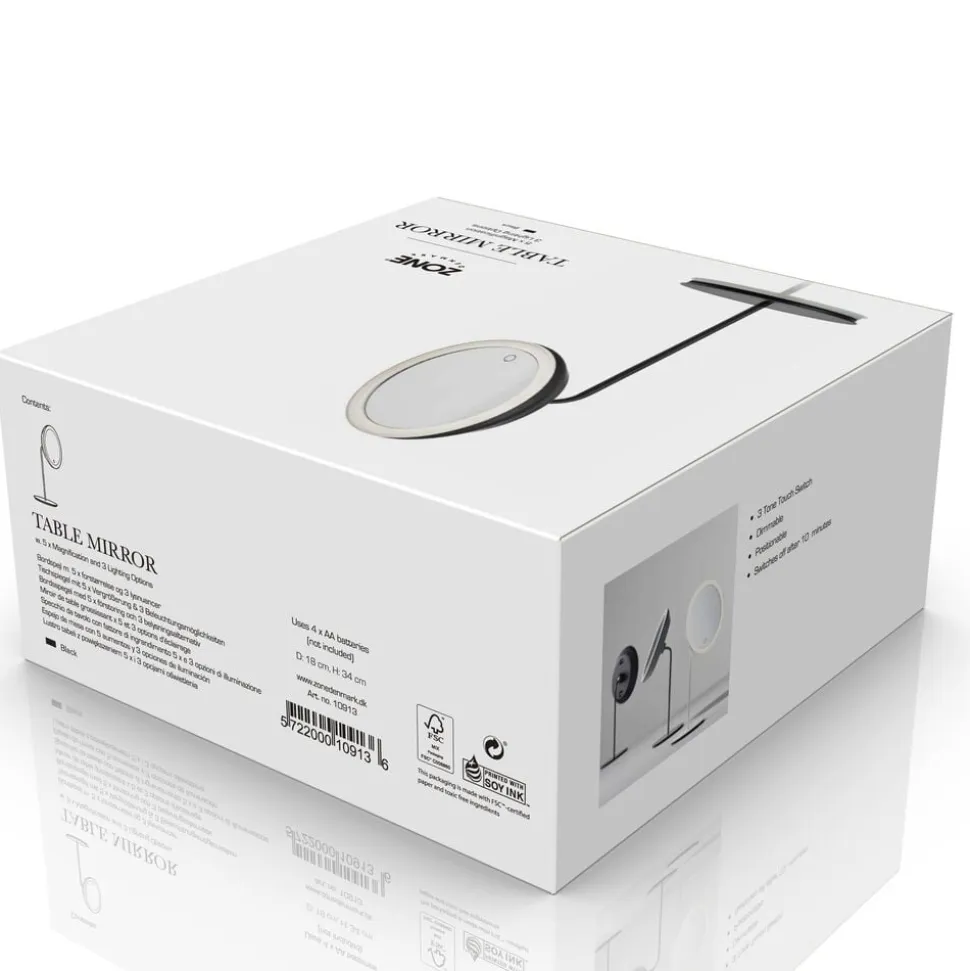 Bordspejl med 5 x forstørrelse og touchfunktion, der aktiverer lys. 3 lysstyrker, slukker selv efter 10 minutter.