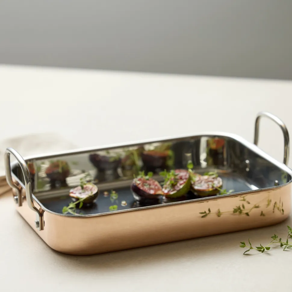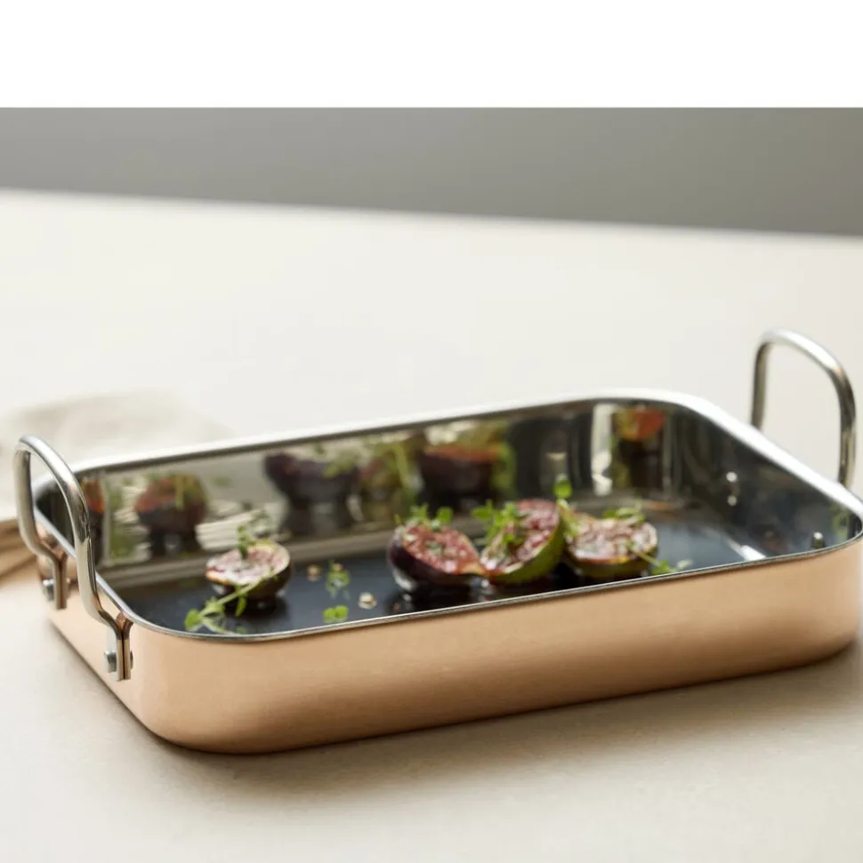 Tidløs, stilfuld og meget funktionel bradepande i kobber og rustfrit stål. Bradepanden er forsynet med håndtag i rustfrit stål. Tåler ovn op til 220 °C. Håndopvask med blød børste og sæbe anbefales. Brug af kobberpudsemiddel vil holde ydersiden blank.