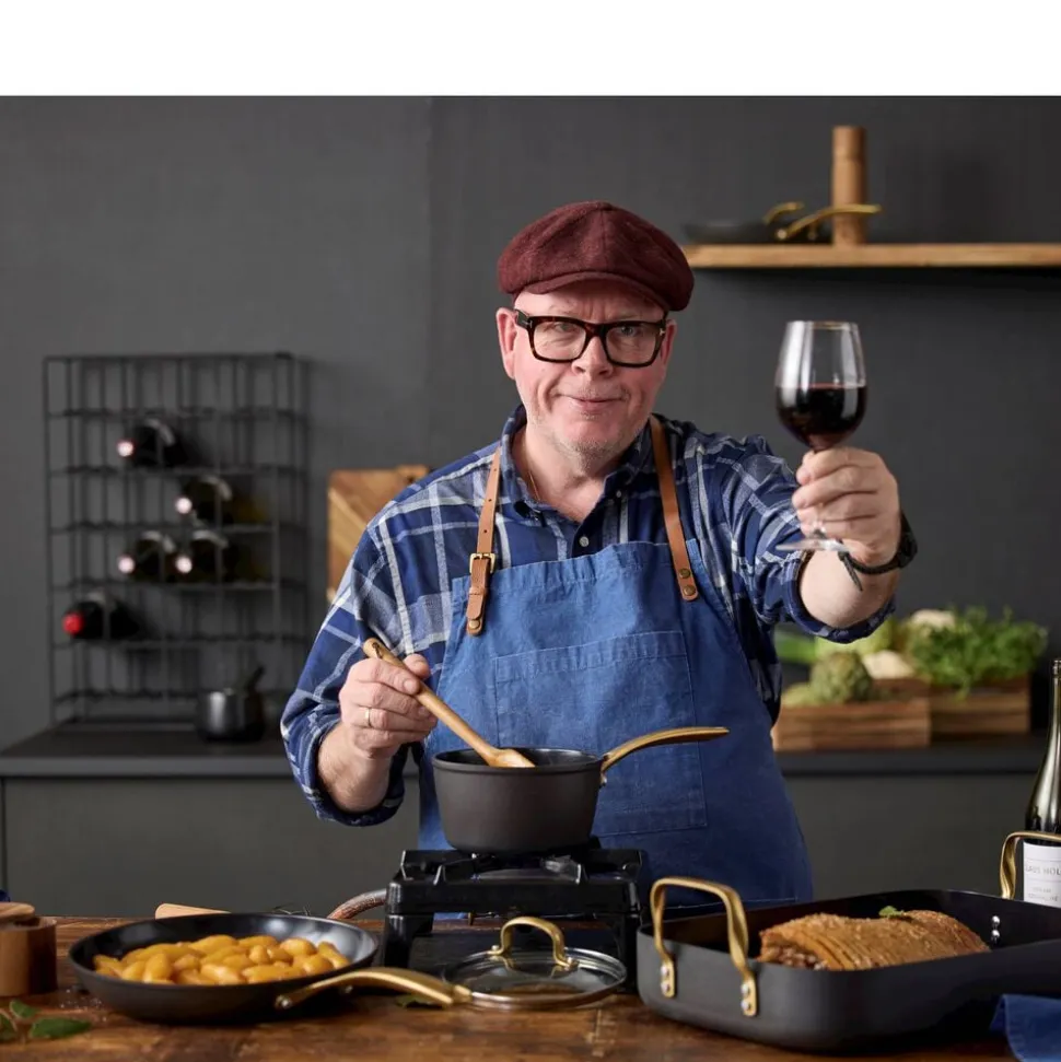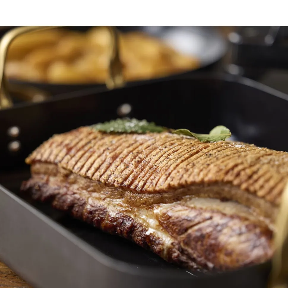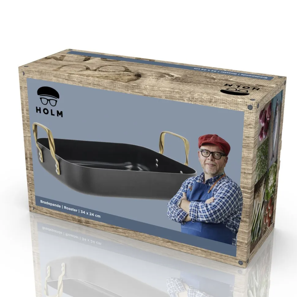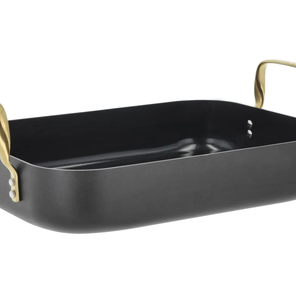 Brasserie-serien er fremstillet i aluminium. Bradepanden har keramisk belægning indvendigt, sort coating udenpå og mat messingfarvede håndtag. Tåler ovn op til 220 grader. Vi anbefaler at bruge redskaber i plast eller træ. Ikke egnet til opvaskemaskine. Vaskes med varmt vand og sæbe før første brug. Den keramiske belægning er fremstillet af råvarer, der ikke indeholder PFAS.