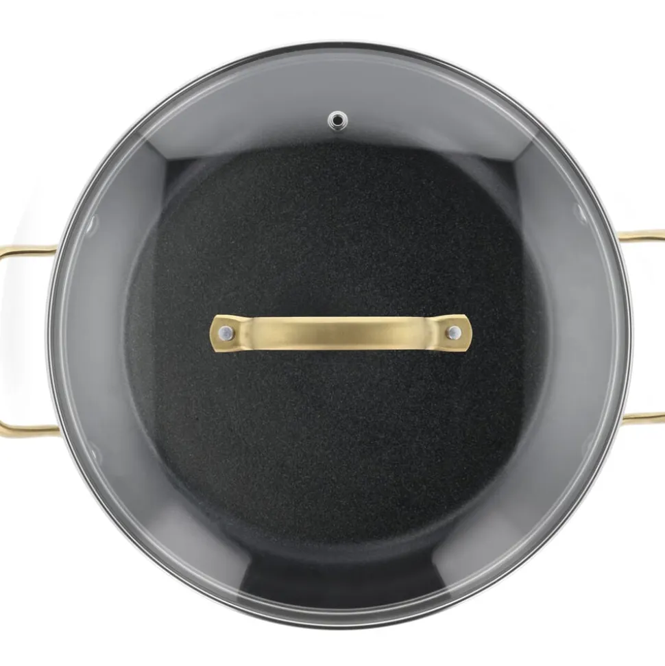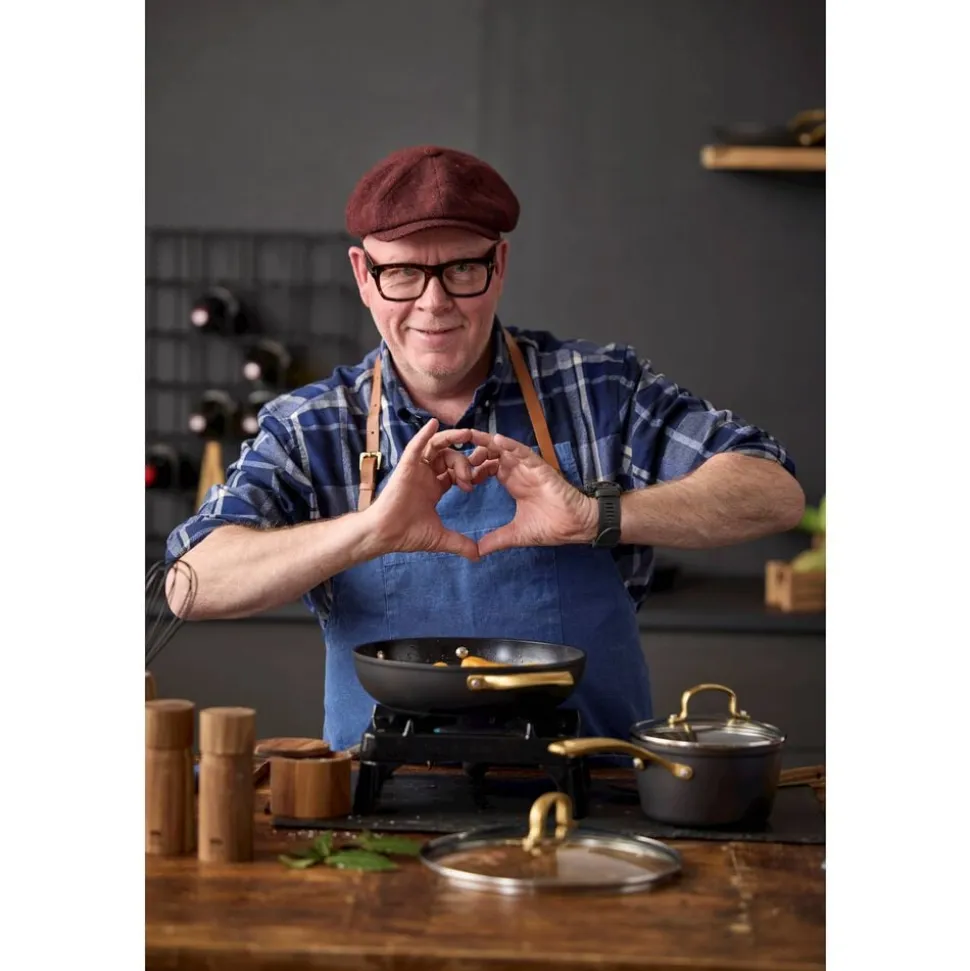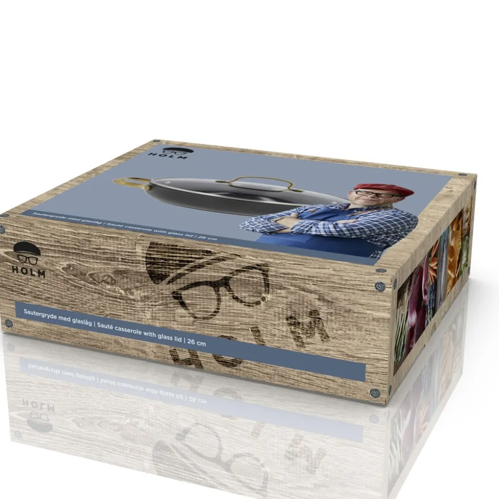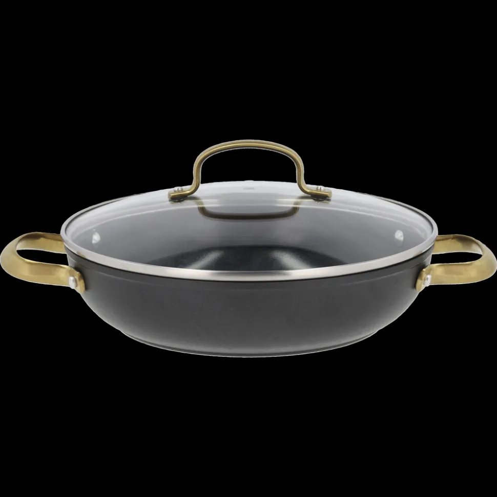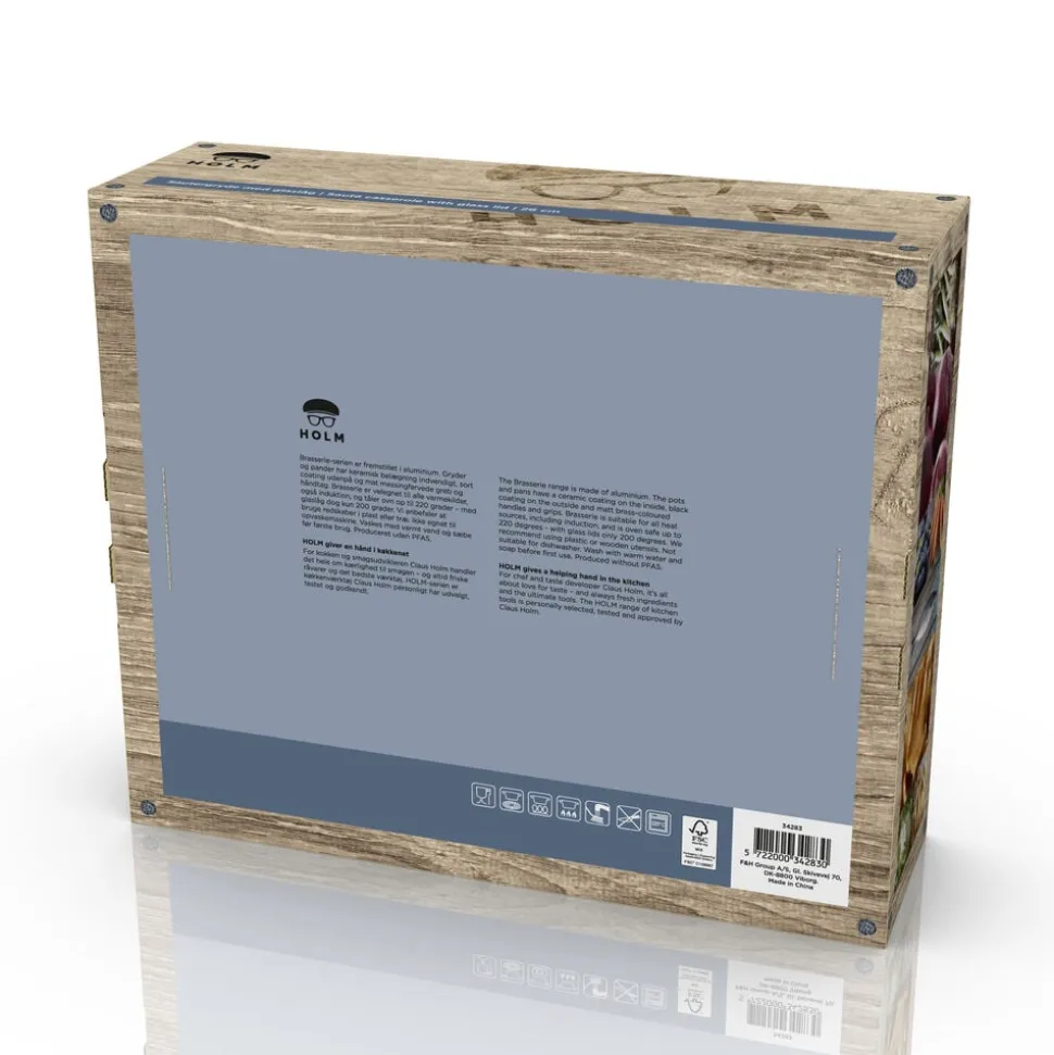 Brasserie-serien er fremstillet i aluminium. Gryder og pander har keramisk belægning indvendigt, sort coating udenpå og mat messingfarvede greb og håndtag. Brasserie er velegnet til alle varmekilder, også induktion, og tåler ovn op til 220 grader – med glaslåg dog kun 200 grader. Vi anbefaler at bruge redskaber i plast eller træ. Ikke egnet til opvaskemaskine. Vaskes med varmt vand og sæbe før første brug. Den keramiske belægning er fremstillet af råvarer, der ikke indeholder PFAS.
