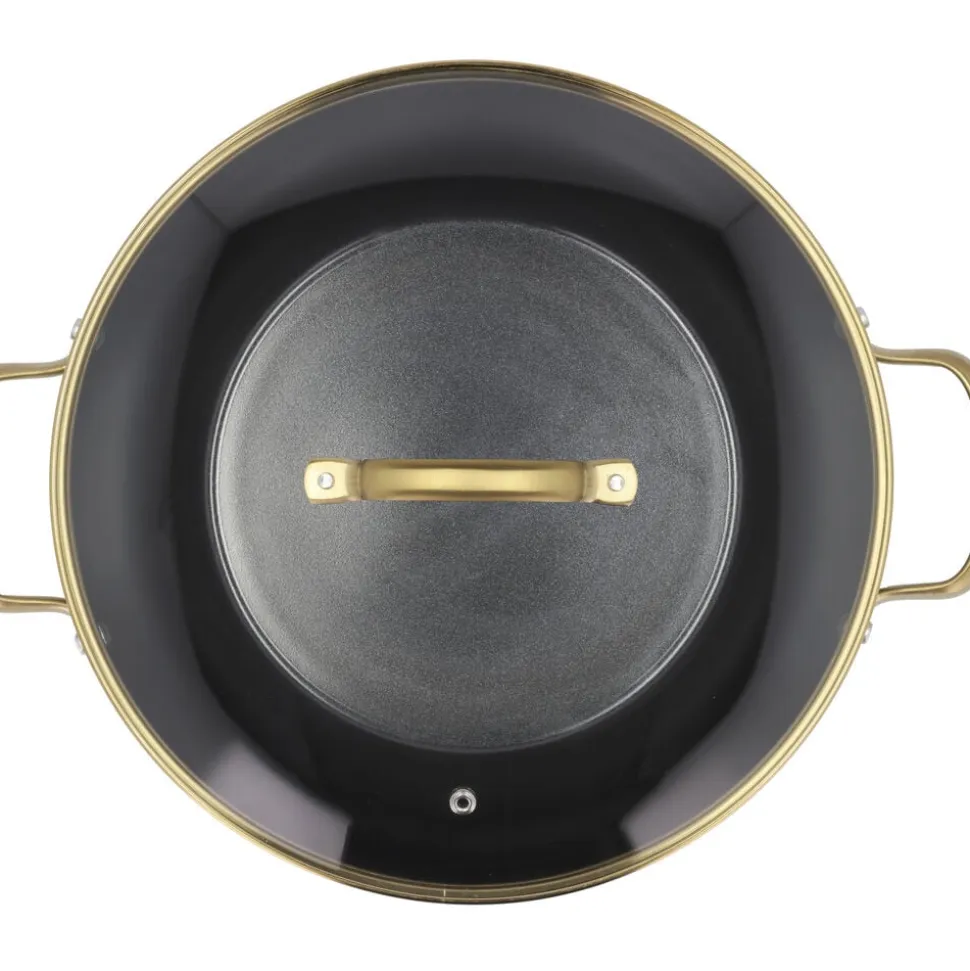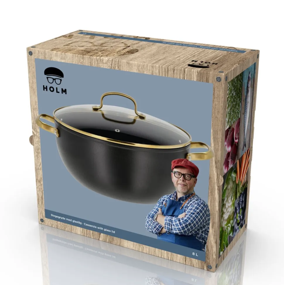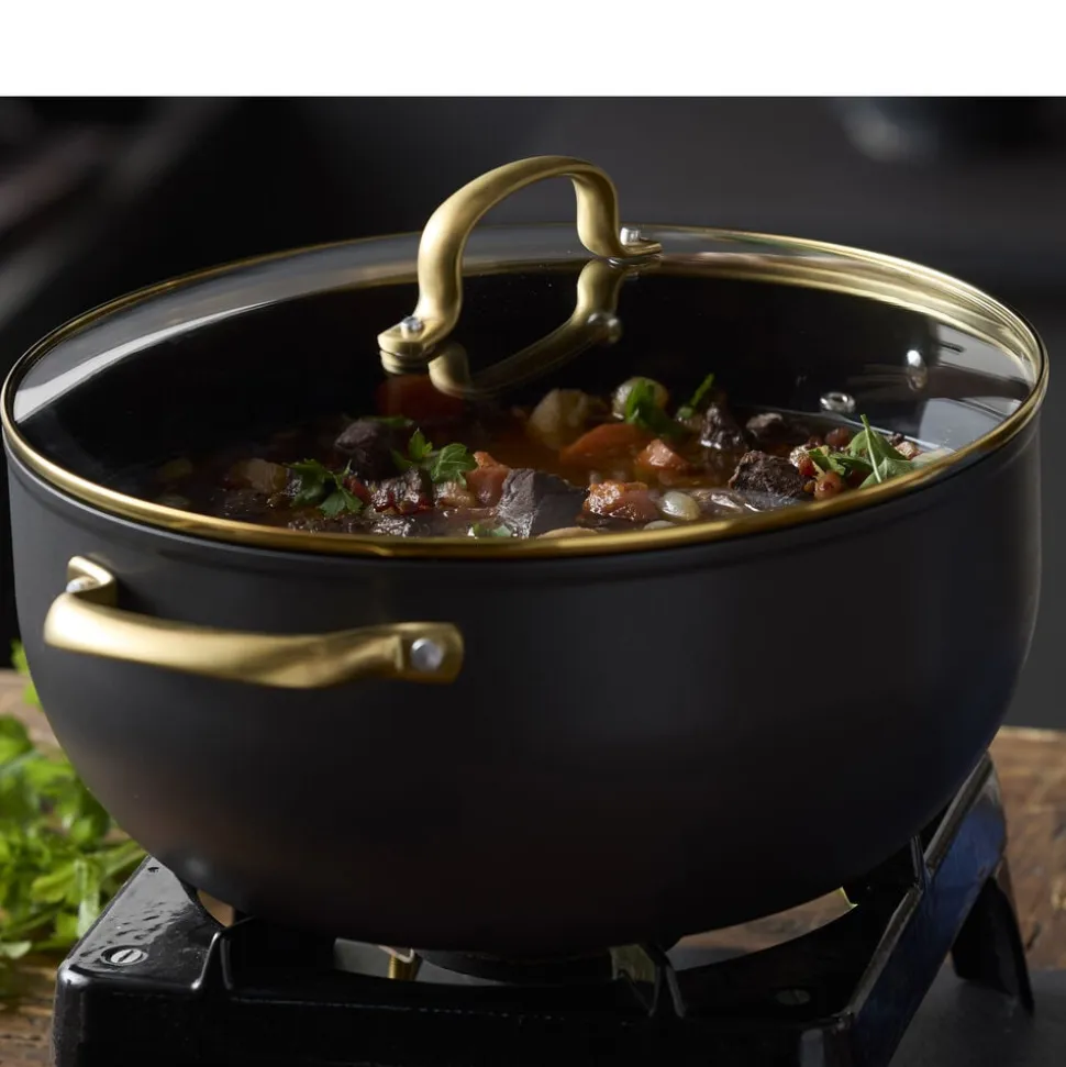 Brasserie-serien er fremstillet i aluminium. Gryder og pander har keramisk belægning indvendigt, sort coating udenpå og mat messingfarvede greb og håndtag. Brasserie er velegnet til alle varmekilder, også induktion, og tåler ovn op til 220 grader – med glaslåg dog kun 200 grader. Vi anbefaler at bruge redskaber i plast eller træ. Ikke egnet til opvaskemaskine. Vaskes med varmt vand og sæbe før første brug. Den keramiske belægning er fremstillet af råvarer, der ikke indeholder PFAS.