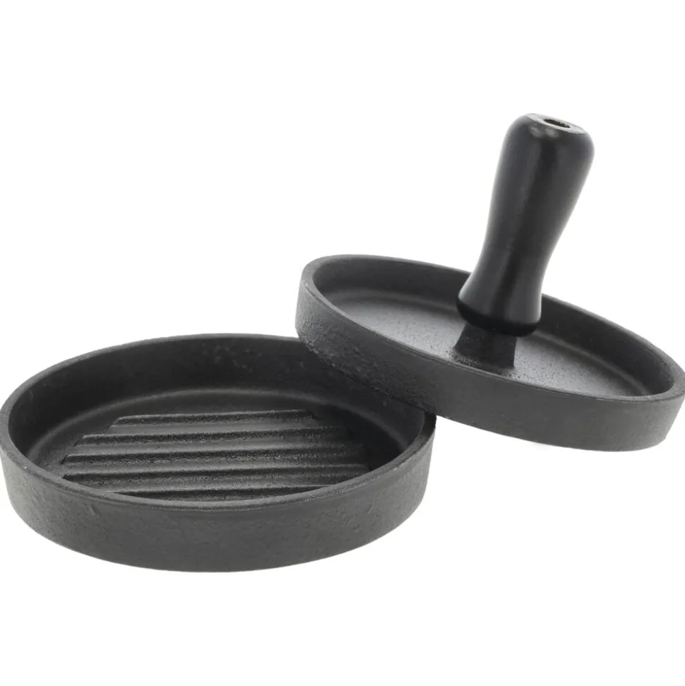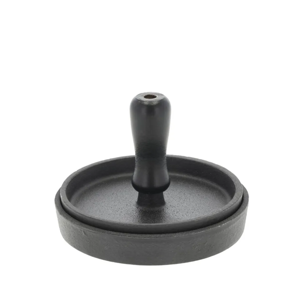Burgerpresser fremstillet i oliebehandlet støbejern. Oliebehandlingen lægger bunden til en naturlig belægning, som giver gode stegeegenskaber, og støbejernet fastholder og fordeler varmen jævnt og effektivt. Få perfekte runde bøffer og slip samtidig for fedtede fingre. Den nederste del af burgerpresseren kan bruges til stegning af bøffen på komfur eller grill. Den øverste del med trægrebet må ikke bruges på komfur eller grill.
