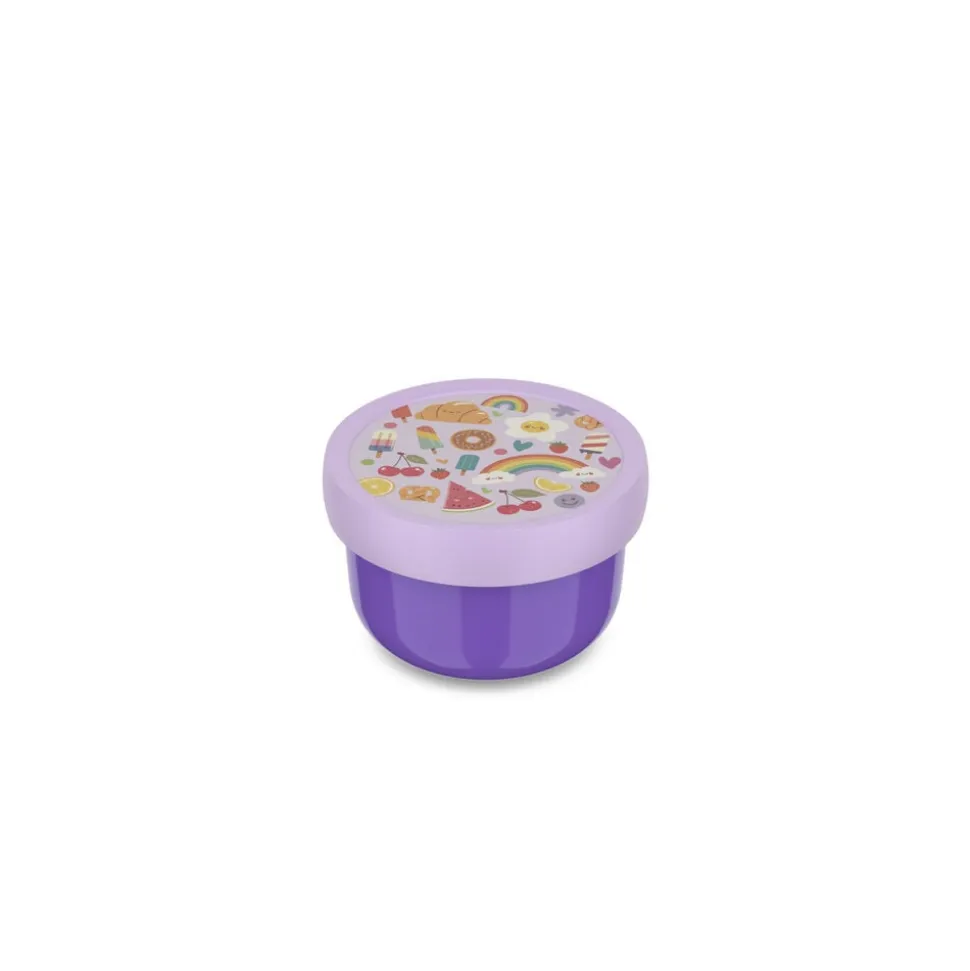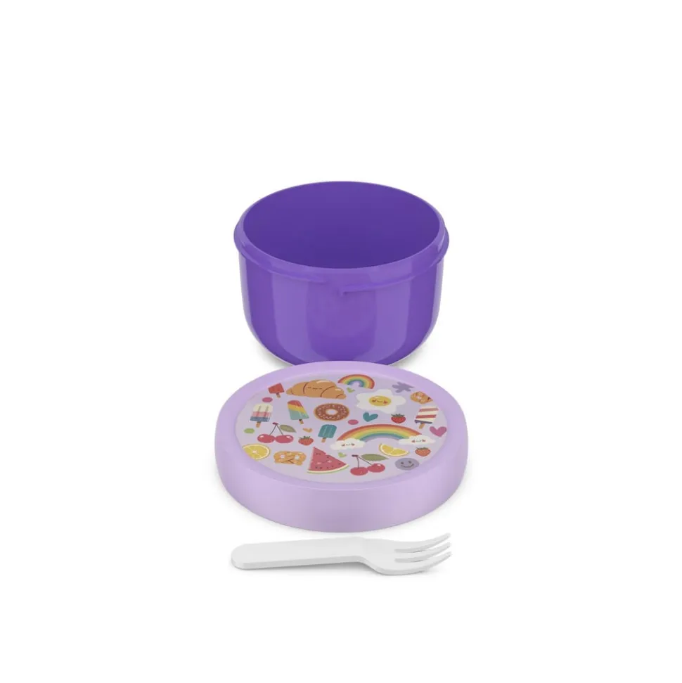 Mepals lille runde 300 ml Campus frugtboks med gaffel holder helt tæt og er nem for børnene at bruge. Boksen er ensfarvet med motiv på låget og fås med de samme motiver som de andre produkter i Mepals Campus-serie til børn. Frugtboksen kan vaskes i opvaskemaskine og kan (dog uden låg) anvendes i mikroovn. Fremstillet i Holland.