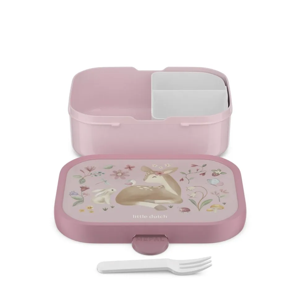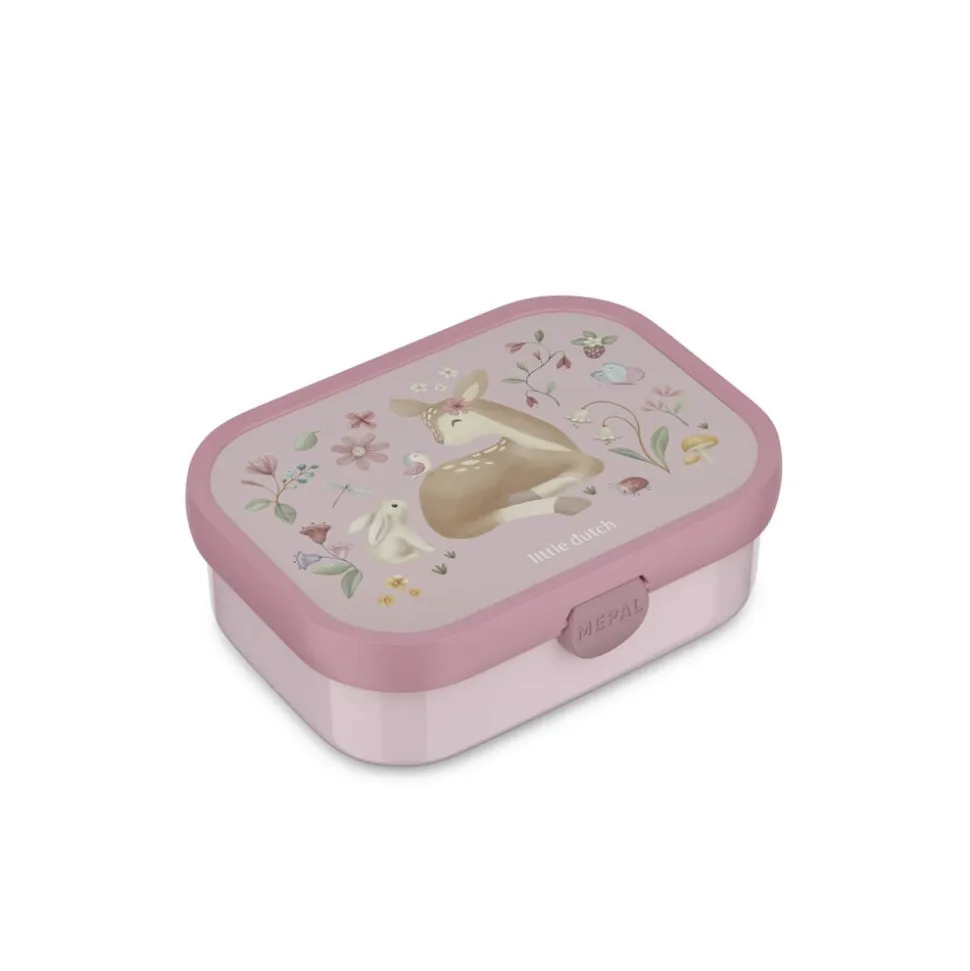 Robust og rummelig Mepal madkasse med Fairy garden-motiv. Madkassen har en smart og effektiv lukkemekanisme, som er nem for børnene at betjene. Madkassen måler 17,5 x 13 x 6 cm og indeholder en lille gaffel og en aftagelig indsats med to små rum.