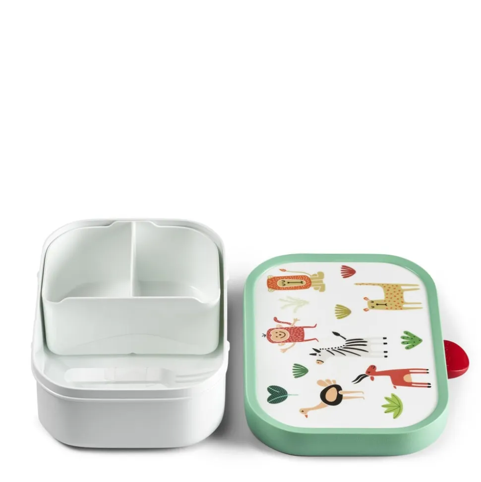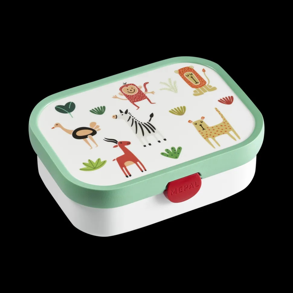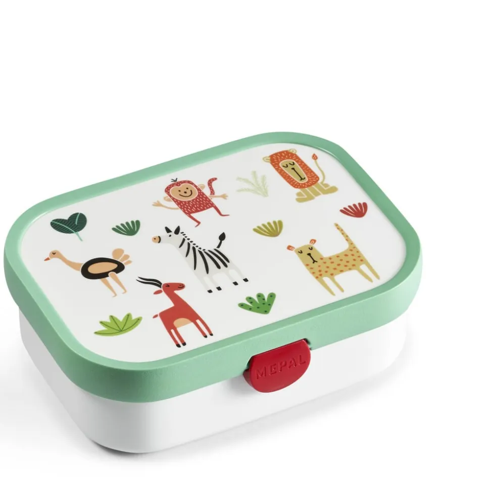 Robust og dekorativ Mepal madkasse med motiv med dyr fra savannen. Den har en ny, forbedret lukkemekanisme, som er endnu nemmere for børnene at betjene. Madkassen indeholder en lille gaffel og en aftagelig indsats med to små rum og måler 17,5 x 13 x 6 cm.
