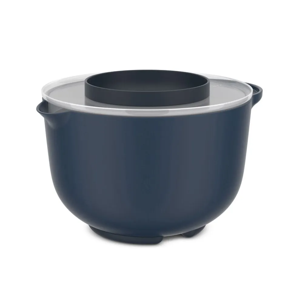 Den 3-liters skål har et stænklåg/piskelåg, der holder dejen i skålen, når du tager den lille skål i midten ud og pisker ingredienserne med håndmikseren. Den lille skål i låget slutter helt tæt, og når den er sat i, kan du dække din dej og opbevare den i køleskabet til senere. Den lille skål i låget kan også bruges til at hvile din dejskraber på eller opbevare ingredienser, som skal tilsættes senere.
