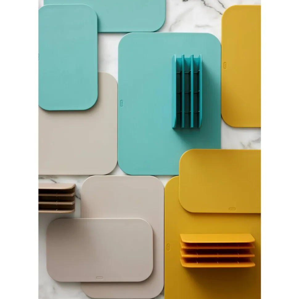 Til serien fås en smart holder med fokus på både opbevaring og hygiejne. Den holder skærebrætterne samlet, uden at de optager meget plads på køkkenbordet, og er udformet, så du kan sætte et fugtigt skærebræt direkte i holderen. Skærebrætterne står nemlig med lidt afstand til hinanden, og i bunden af holderen er der riller, som sikrer god ventilation og dermed hygiejne, f.eks. hvis brættet stadig er fugtigt, når det sættes på plads. Brætterne kan vaskes i opvaskemaskine.