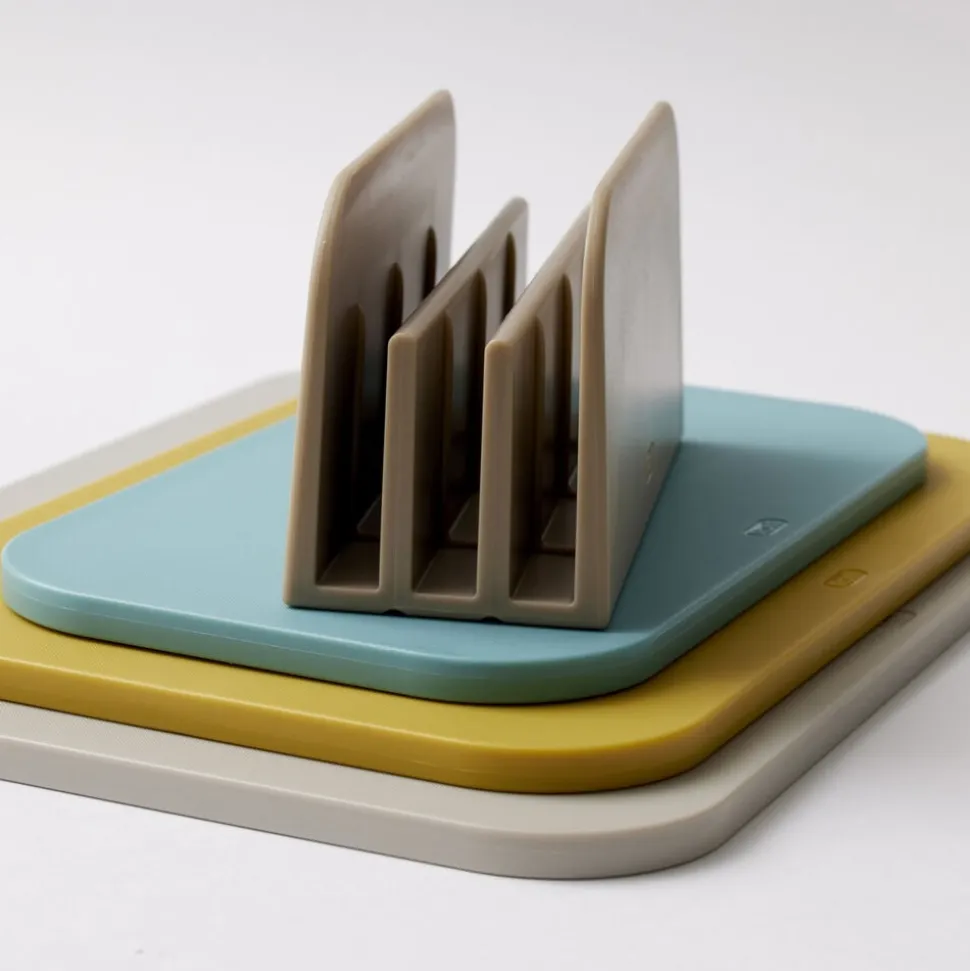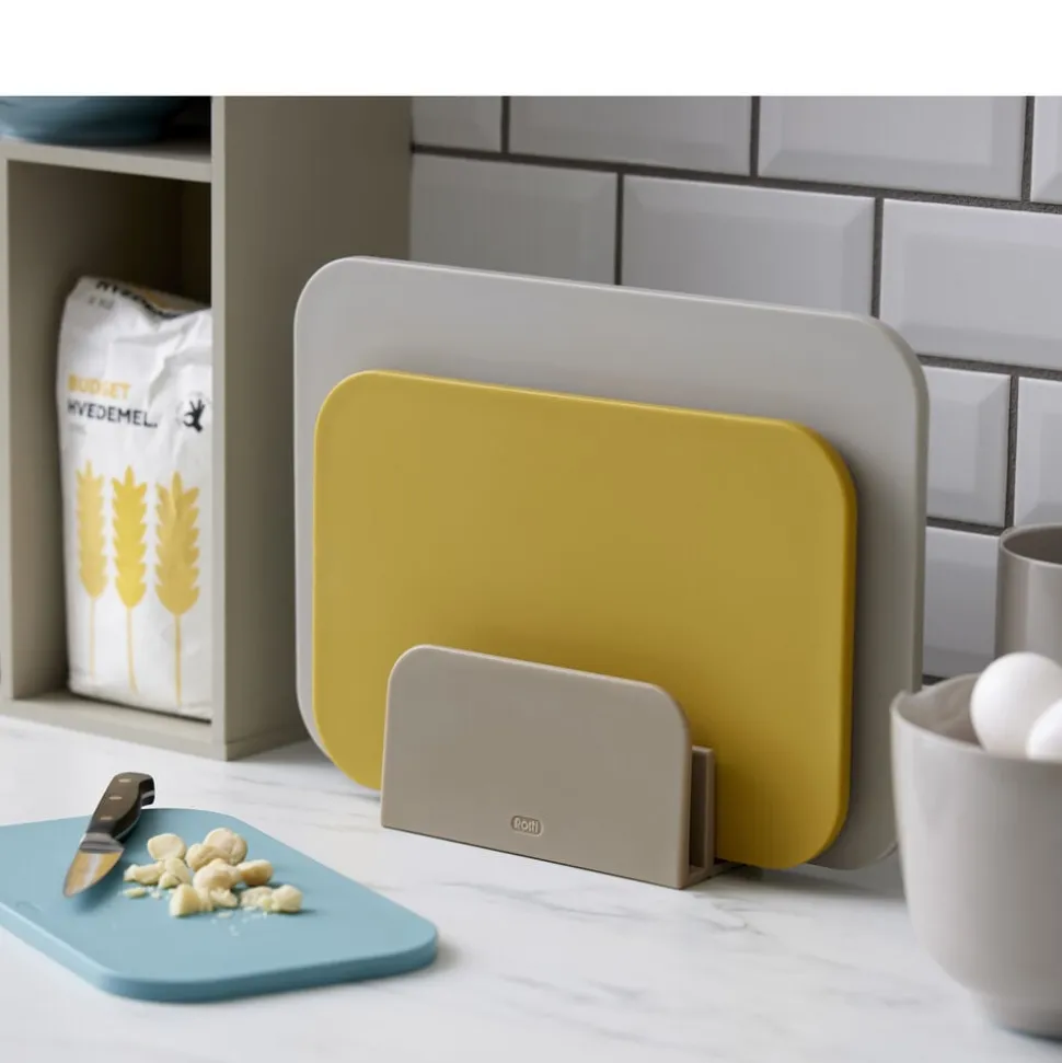 Sættet kommer med en smart holder med fokus på både opbevaring og hygiejne. Den holder skærebrætterne samlet, uden at de optager meget plads på køkkenbordet, og er udformet, så du kan sætte et fugtigt skærebræt direkte i holderen. Skærebrætterne står nemlig med lidt afstand til hinanden, og i bunden af holderen er der riller, som sikrer god ventilation og dermed hygiejne, f.eks. hvis brættet stadig er fugtigt, når det sættes på plads. Brætterne kan vaskes i opvaskemaskine.