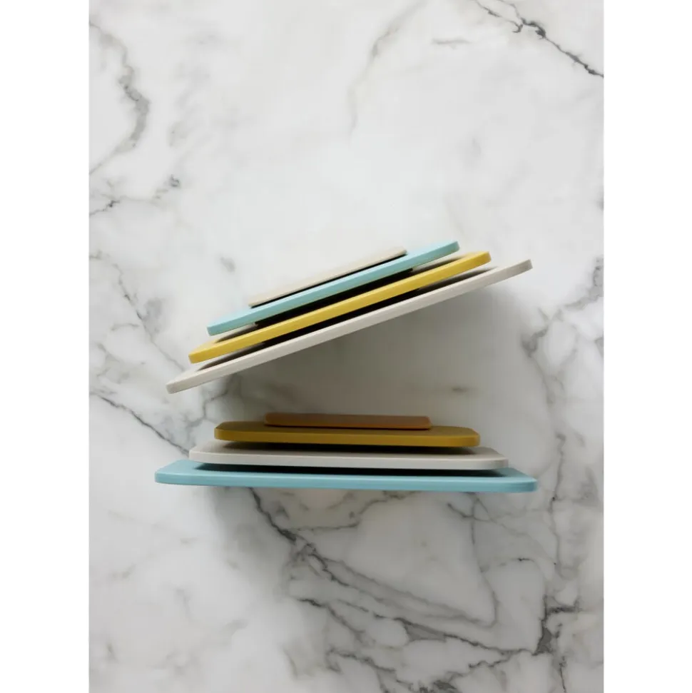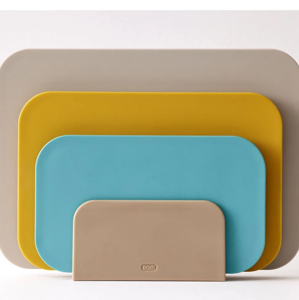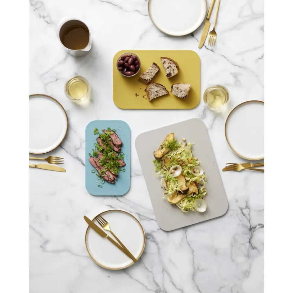 De tre størrelser er samme tykkelse og kan sagtens anvendes til servering og tages med ind på bordet til brød, pølse, oste og tapasanretninger med mere. Derfor er seriens fine farver valgt med grundig omtanke, og med sine venlige former bliver sættet et dekorativt supplement til din køkkenindretning.