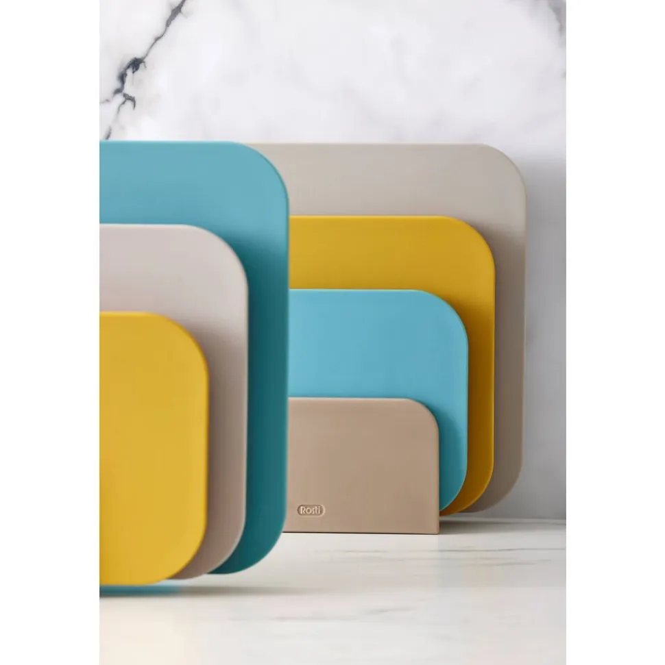 Choptima skærebrætter i størrelserne 26,5 x 16 cm, 30,5 x 20,5 cm og 35,5 x 25,5 cm og farverne curry, humus og nordic green.