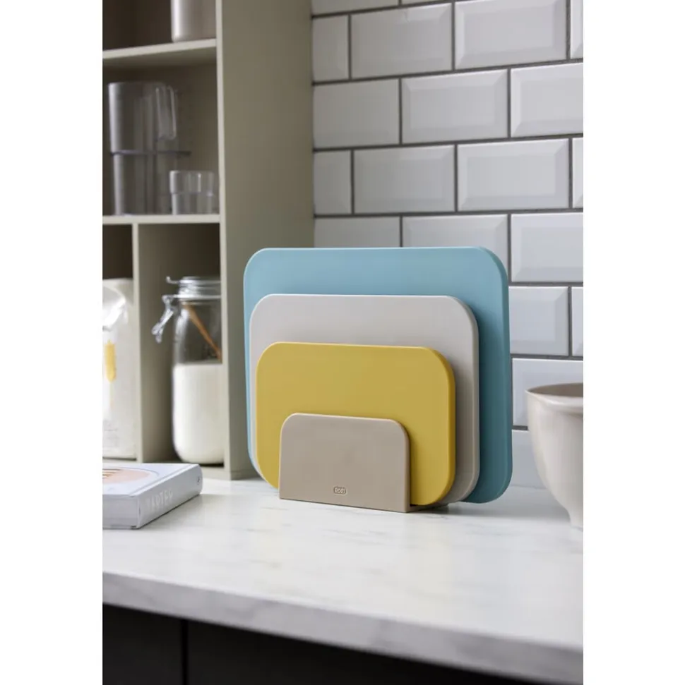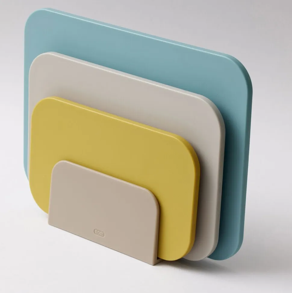Sættet kommer med en smart holder med fokus på både opbevaring og hygiejne. Den holder skærebrætterne samlet, uden at de optager meget plads på køkkenbordet, og er udformet, så du kan sætte et fugtigt skærebræt direkte i holderen. Skærebrætterne står nemlig med lidt afstand til hinanden, og i bunden af holderen er der riller, som sikrer god ventilation og dermed hygiejne, f.eks. hvis brættet stadig er fugtigt, når det sættes på plads. Brætterne kan vaskes i opvaskemaskine.