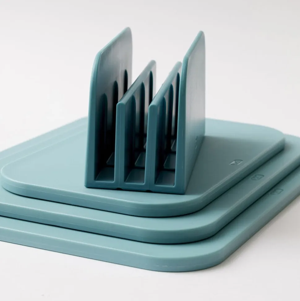 Sættet kommer med en smart holder med fokus på både opbevaring og hygiejne. Den holder skærebrætterne samlet, uden at de optager meget plads på køkkenbordet, og er udformet, så du kan sætte et fugtigt skærebræt direkte i holderen. Skærebrætterne står nemlig med lidt afstand til hinanden, og i bunden af holderen er der riller, som sikrer god ventilation og dermed hygiejne, f.eks. hvis brættet stadig er fugtigt, når det sættes på plads. Brætterne kan vaskes i opvaskemaskine.