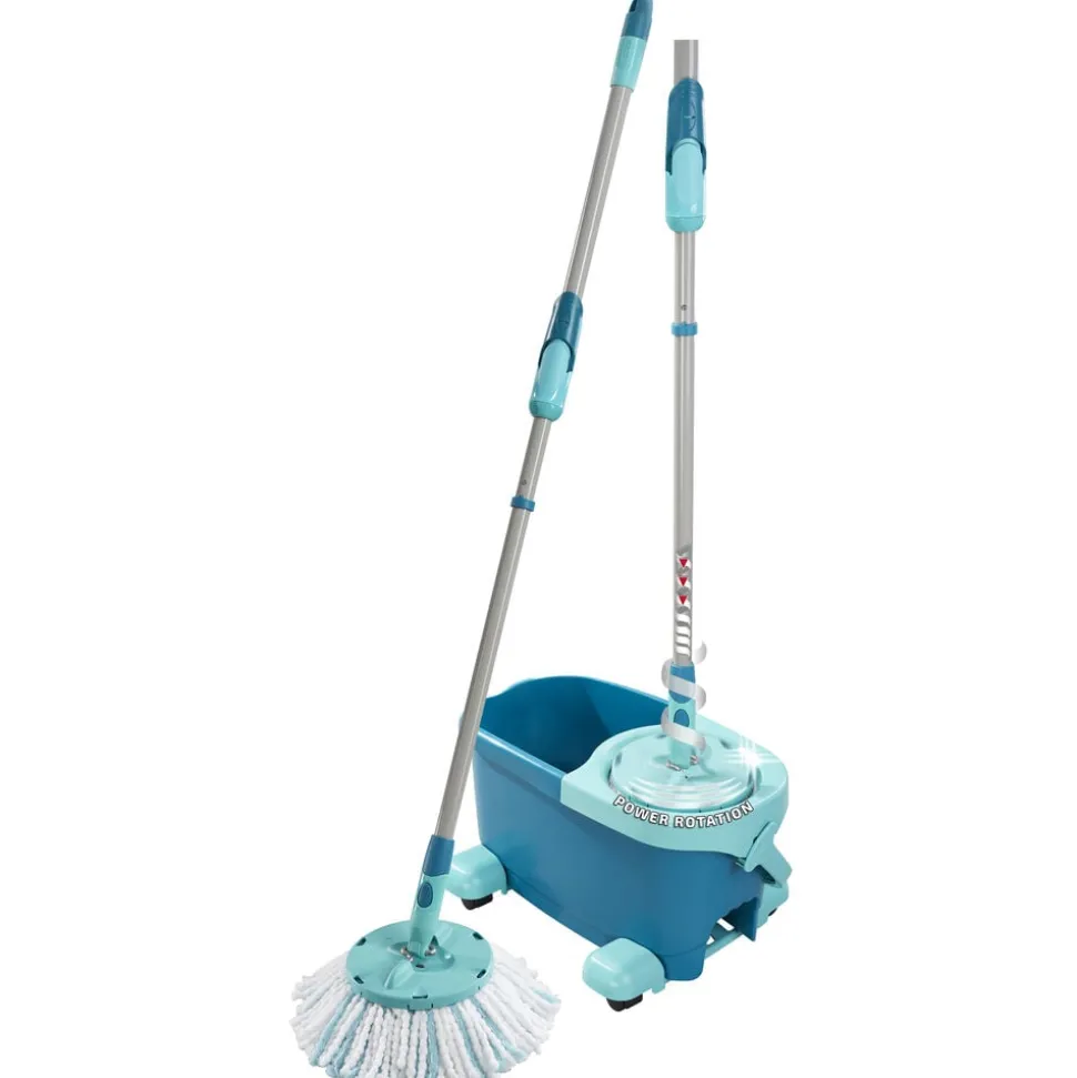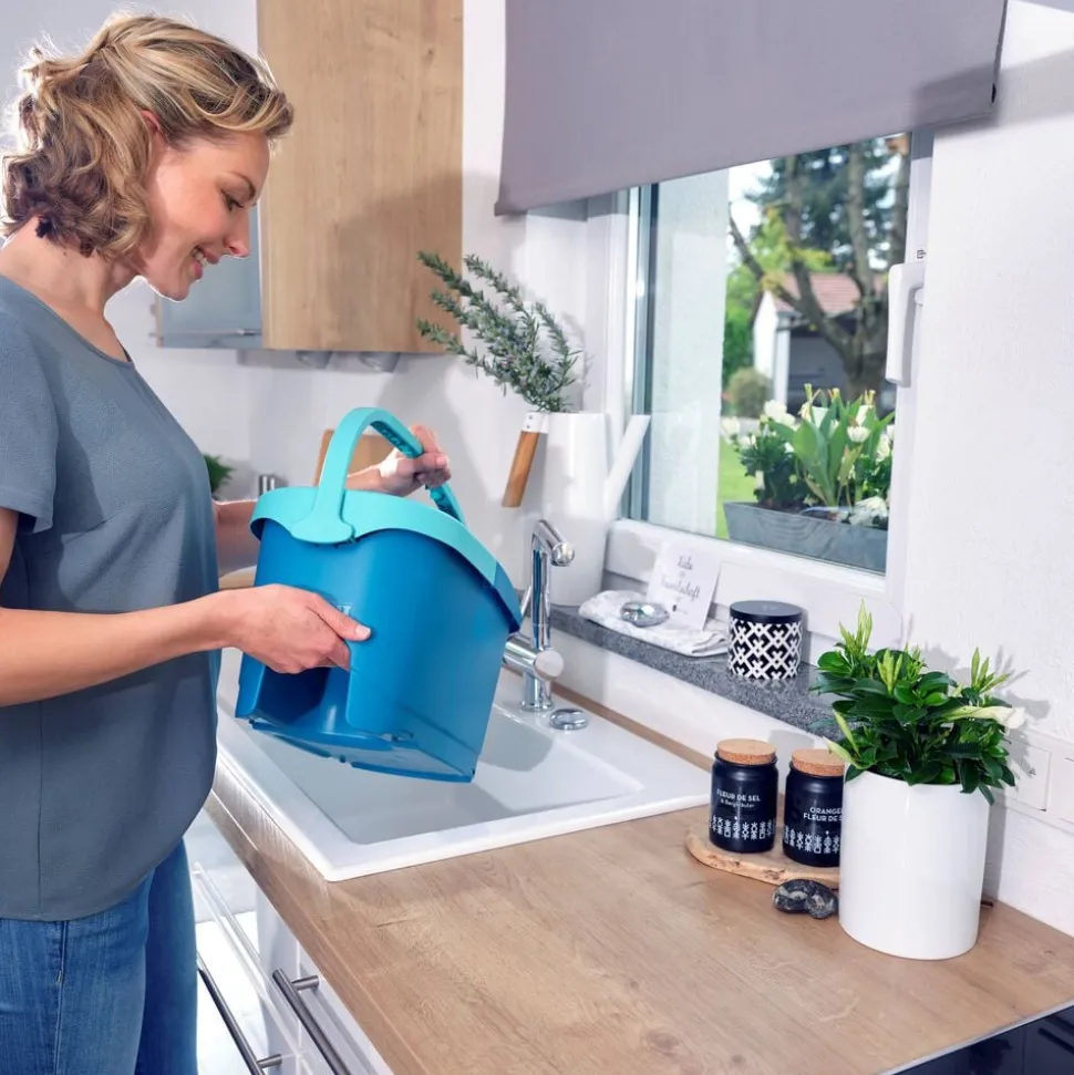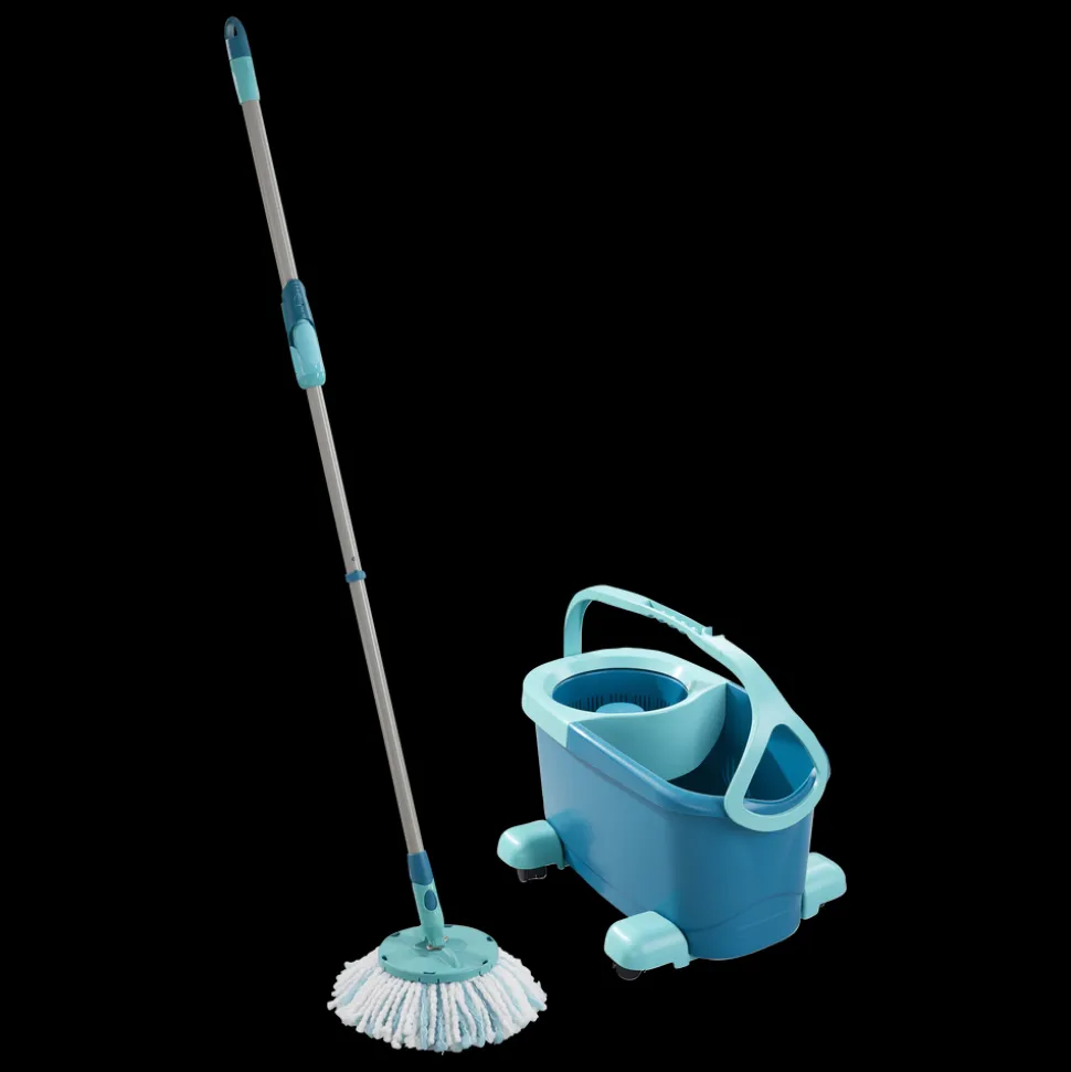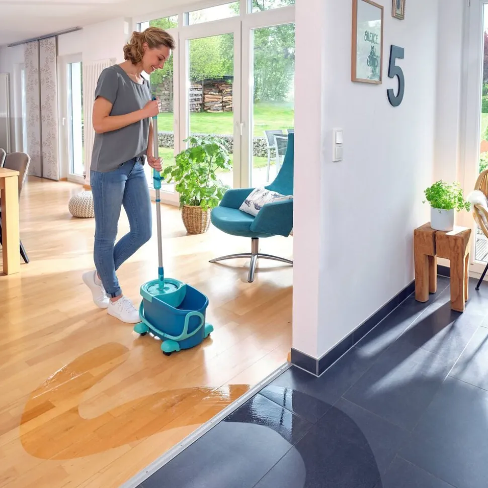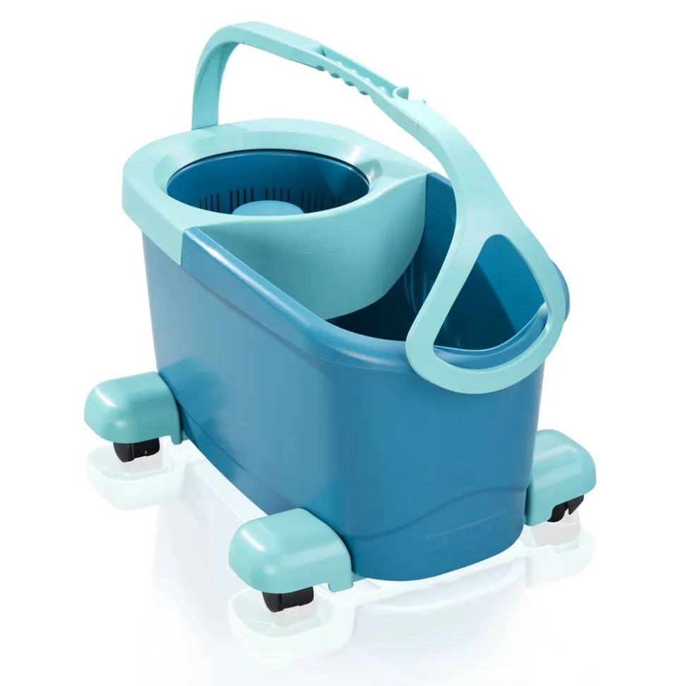 Teleskophåndtag med 360° kugleleje gør det muligt at føre moppen rundt i bølgede linjer og gøre rent under møbler. Under rengøring kan håndtaget sættes fast på den integrerede holder, så det ikke vælter, når spanden uden problemer skubbes rundt ved hjælp af rullevognen. Spanden er desuden nem at tømme via den brede hælde-ende. Det superbløde moppehoved kan maskinvaskes ved 60 °C.