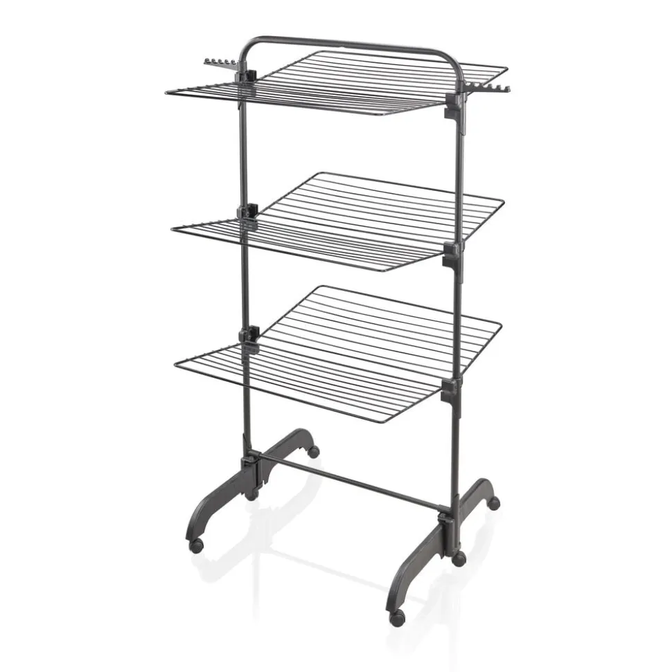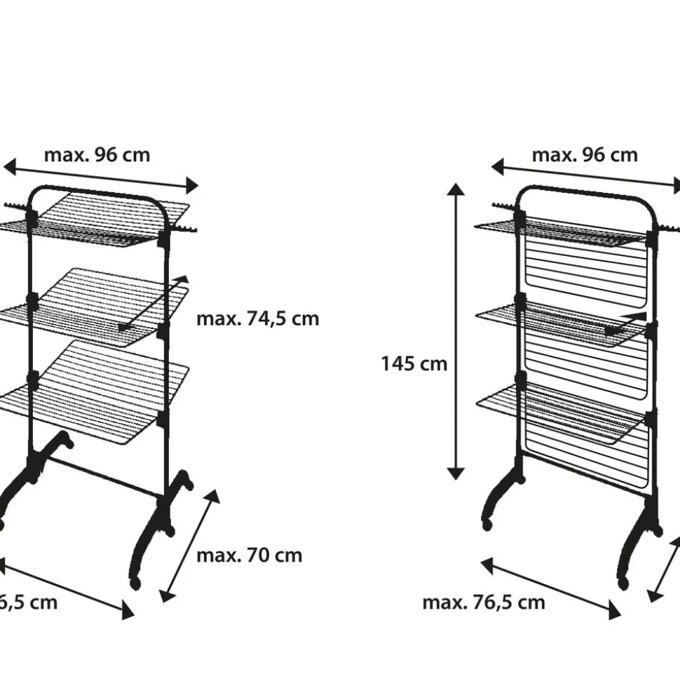 Comfort Tower 420 er et pladsbesparende tørrestativ, der udnytter højden og gør det nemt at tørre meget tøj på minimal gulvplads. Tørrestativet har tre fleksible tørreniveauer og i alt 42 meters tørreplads, og hver sektion kan klappes ned individuelt, så stativet også kan bruges op ad en væg eller radiator. Stativet er udstyret med to sidekroge, så du får ekstra ophæng til bluser og skjorter på bøjler. De seks 360° drejbare hjul gør det let at flytte stativet – selv når det er fuldt læsset – og når det ikke er i brug, kan det foldes fladt sammen og gemmes væk. 5 års garanti.