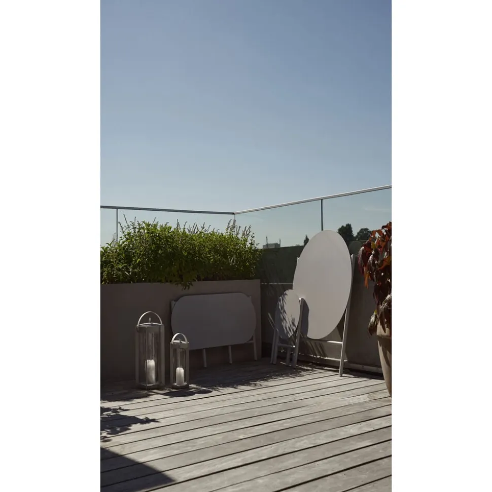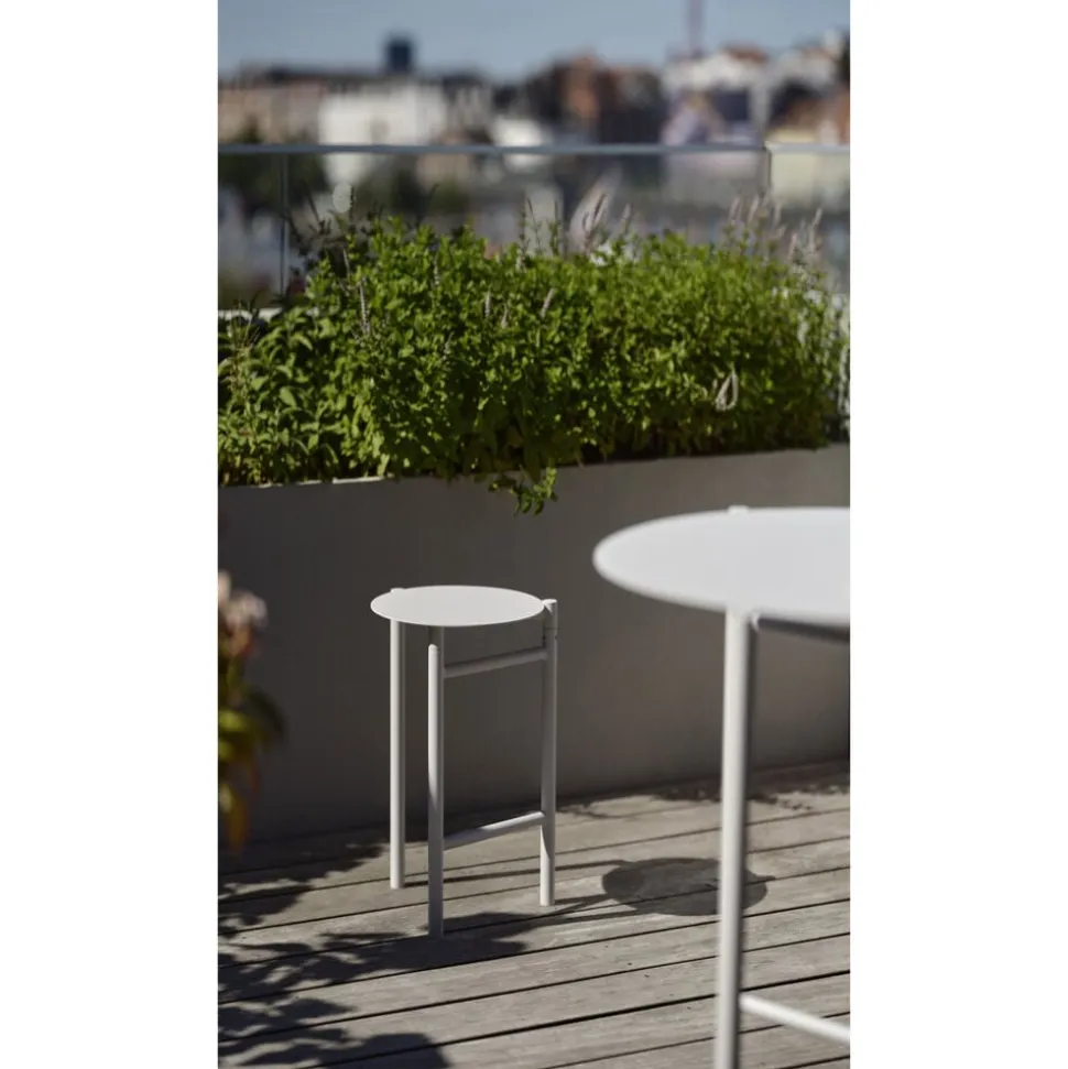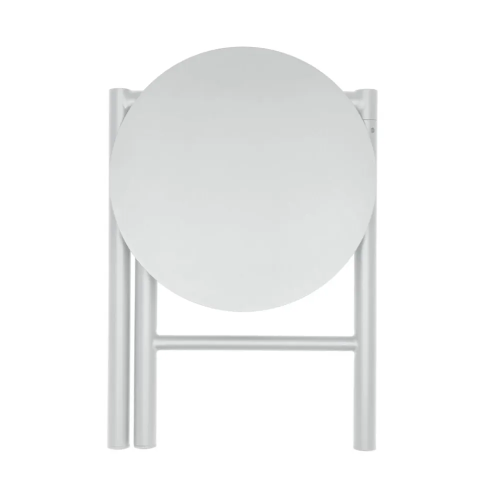 Den trebenede taburet kan let løftes rundt, og når du ikke bruger den, kan sædet vippes op, og den kan klappes sammen. Pladsbesparende og praktisk. Sædets cirkelformede siddeplads og det enkle stel har et næsten ikonisk udtryk. Taburetten er udført i pulverlakeret stål og kan derfor holde til livet både ude og inde. Nyd synet, fleksibiliteten og friheden.