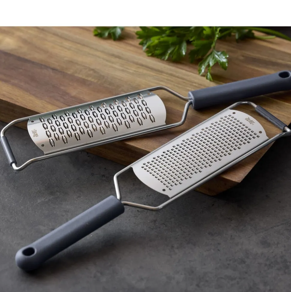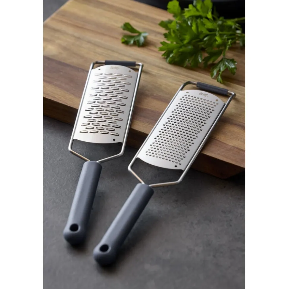 Fint rivejern i rustfrit stål med håndtag af hård plast og silikonestøtte i toppen af rivejernet. Rivejernet er oplagt til rivning af for eksempel parmesanost og citrusskal.