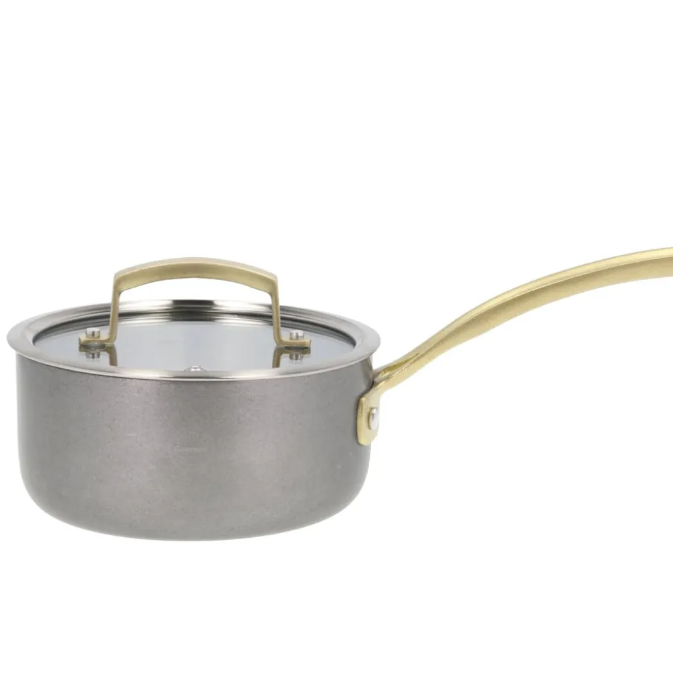 Fremstillet af 18/10 rustfrit stål med en kraftig 2,5 mm 3-lags konstruktion af rustfrit stål, aluminium og rustfrit stål. Mellemlaget af aluminium sikrer optimal varmefordeling. Pånittede støbte stålhåndtag, som er PVD-forgyldt. Ydersiden har en vintage polering. Glaslåg med damphul. Målestreger indvendigt på kasseroller og gryder. Passer til alle varmekilder inkl. induktion. Håndopvask anbefales.