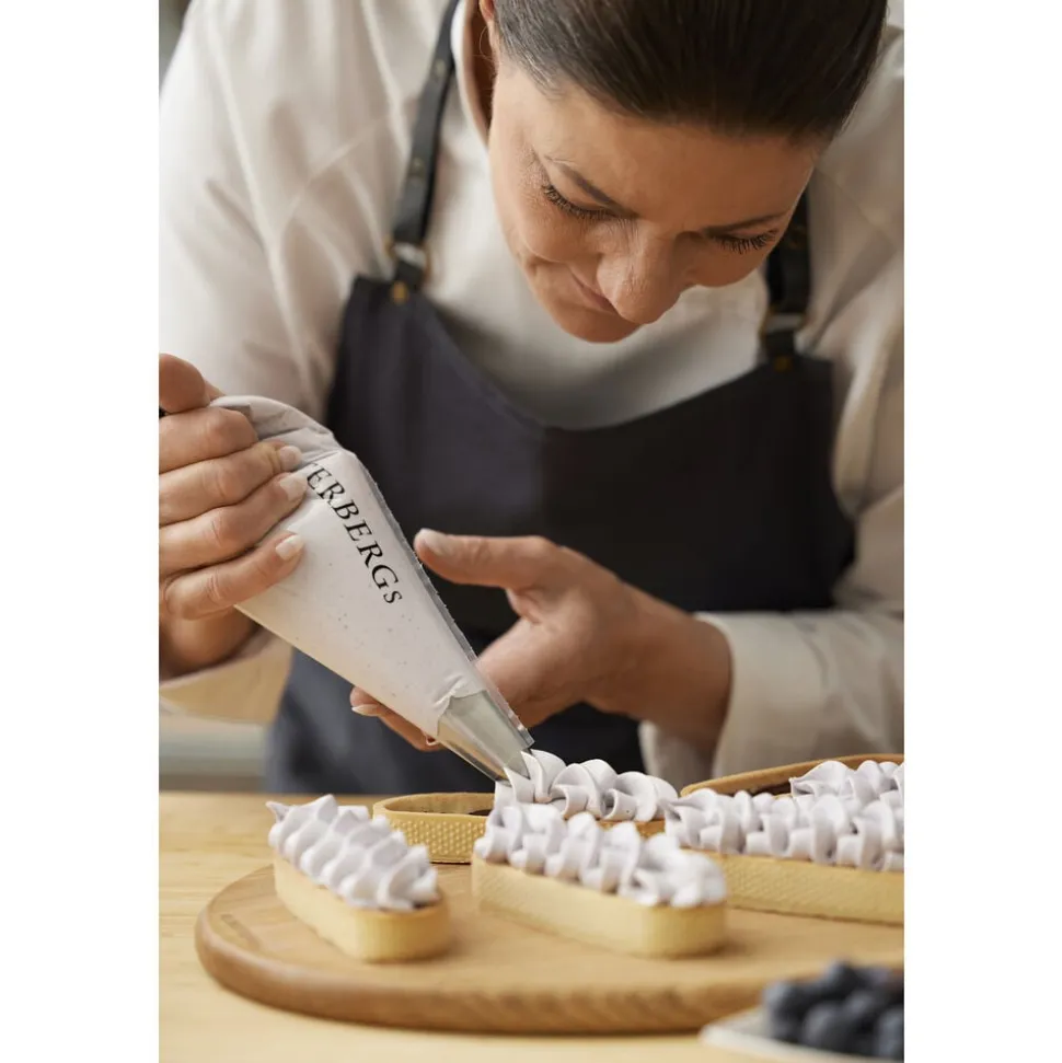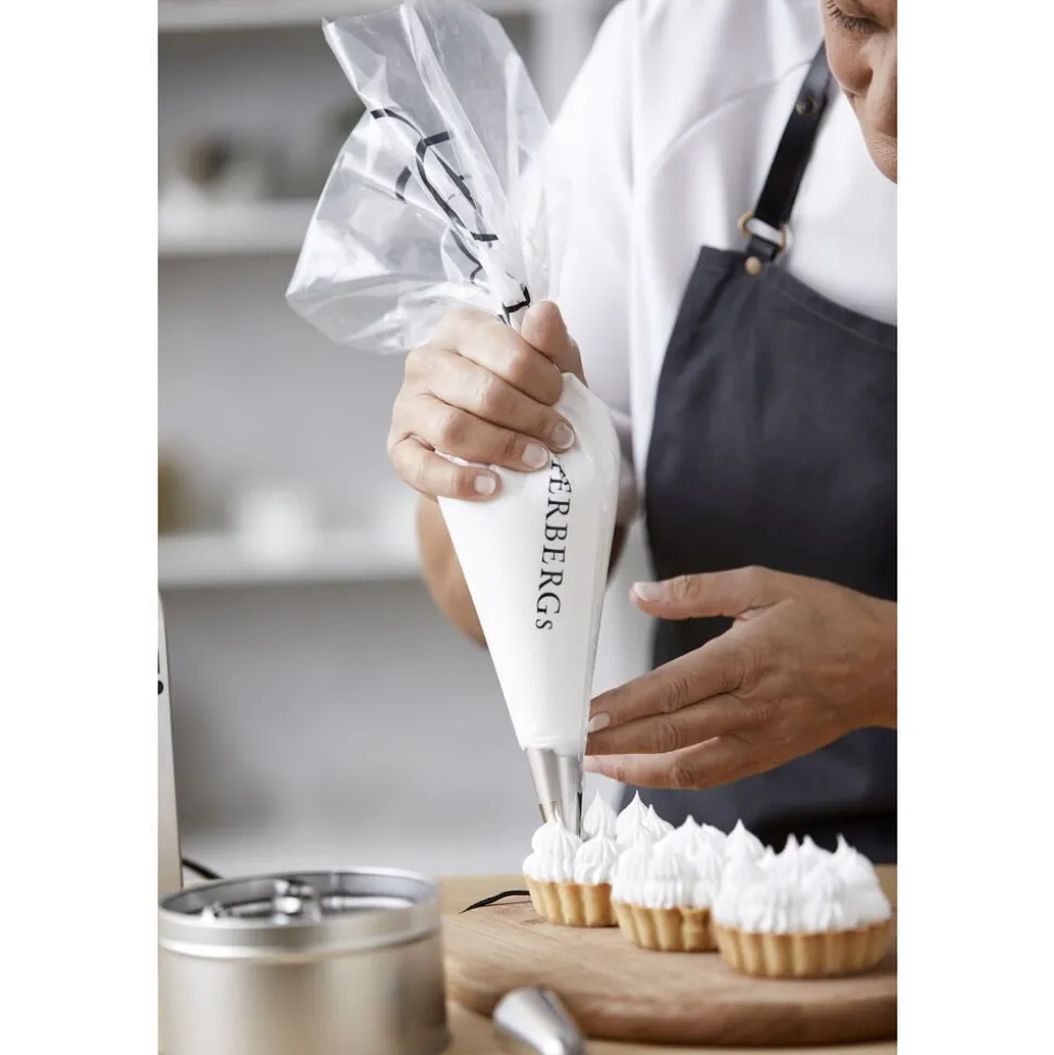 Hygiejniske engangssprøjteposer i kraftig, professionel kvalitet til både det søde og det salte køkken. Anvend dem til fx flødeskum, cremer og mousser og opnå et flottere resultat, da det er meget nemmere at styre mængden fra en sprøjtepose end med en ske. Klip et passende stort hul til de tyller du eventuelt ønsker at anvende eller anvend dem uden tylle i.
