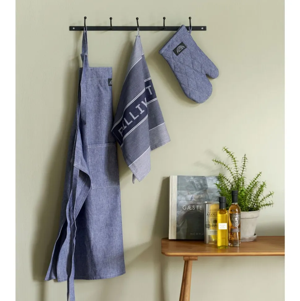 Køkkentekstiler i gode design i både klassiske og moderigtige farver. Tekstilerne vaskes ved 40 grader. Overskudsfarve kan forekomme, især ved mørke farver, derfor anbefales separat vask. Brug vaskemiddel uden optisk hvidt og blegemiddel. Krympning 5-10 %. Tekstilet kan “trækkes” glat eller stryges.
