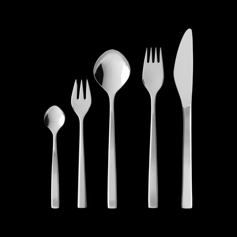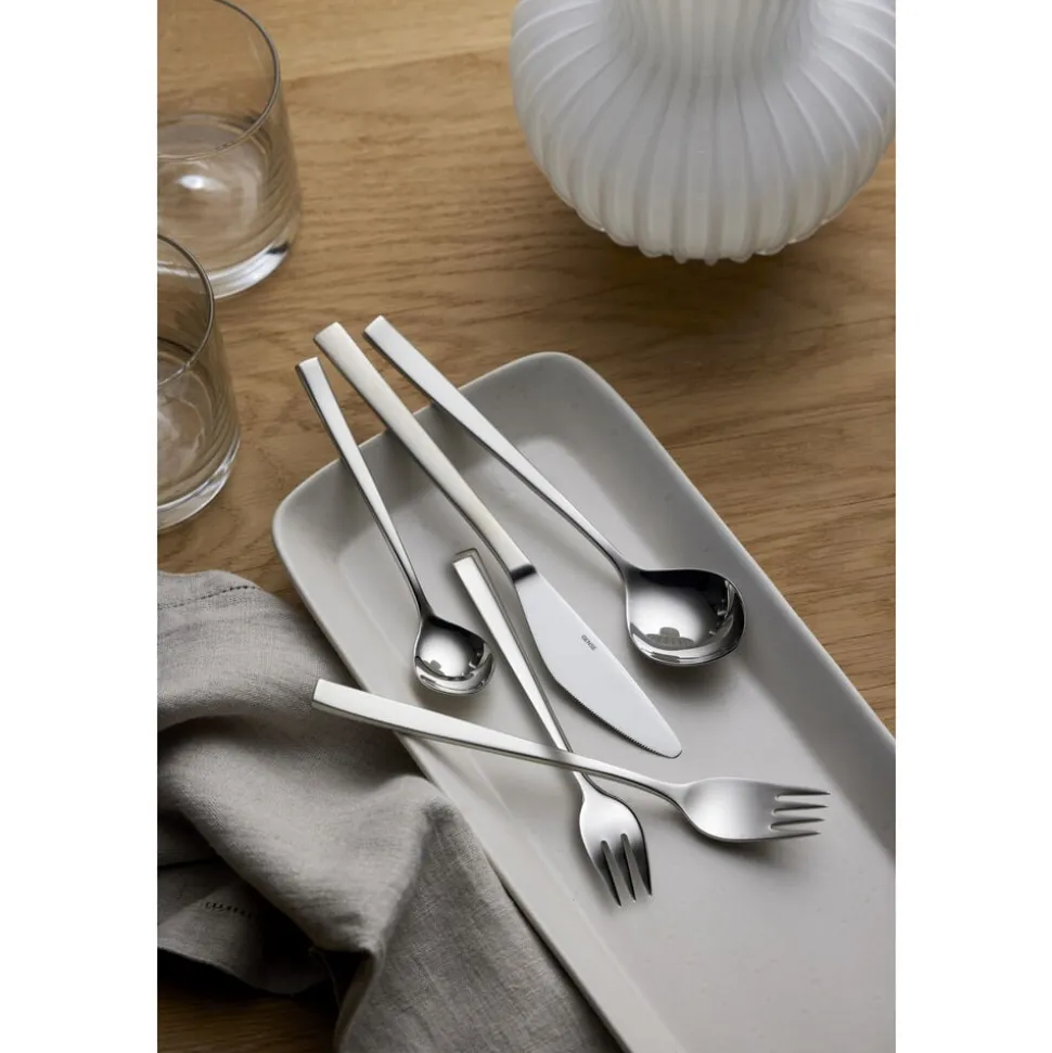 Gense Fuga har et klassisk design med blødt afrundede linjer, der hviler behageligt i hånden, og en raffineret kontrast i de matte skafter og blankpolerede hoveder. Tias Eckhoff formgav i 1962 det ikoniske bestik, der i sit design formidler klarhed og præcision, men med et subtilt udtryk.
