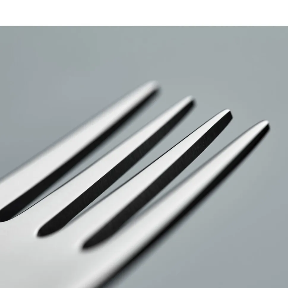 Gense Fuga har et klassisk design med blødt afrundede linjer, der hviler behageligt i hånden, og en raffineret kontrast i de matte skafter og blankpolerede hoveder. Tias Eckhoff formgav i 1962 det ikoniske bestik, der i sit design formidler klarhed og præcision, men med et subtilt udtryk.