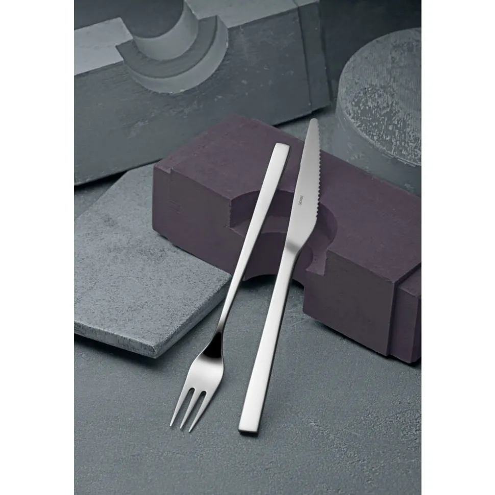 6 sæt kniv og gaffel. Gense Fuga har et klassisk design med blødt afrundede linjer, der hviler behageligt i hånden, og en raffineret kontrast i de matte skafter og blankpolerede hoveder. Tias Eckhoff formgav i 1962 det ikoniske bestik, der i sit design formidler klarhed og præcision, men med et subtilt udtryk.