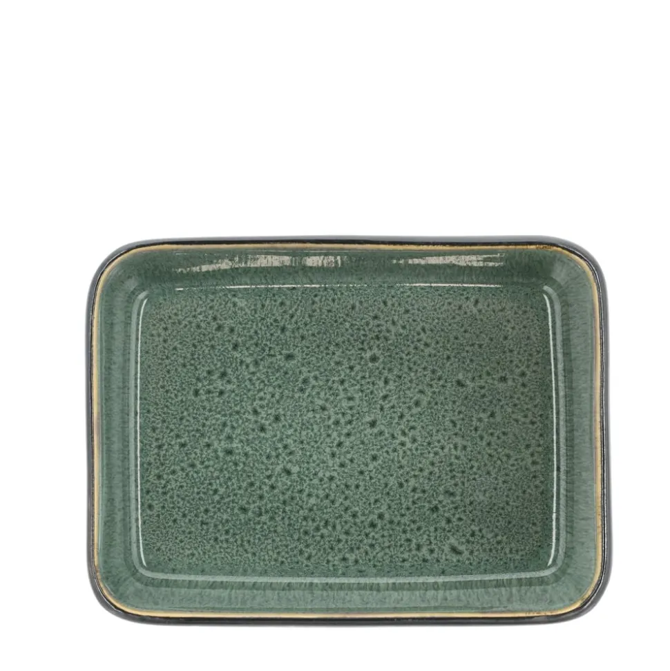 BITZ’ rektangulære fad i mat, sort stentøj med blank grøn glasur på indersiden måler 14 x 19 cm og er 5,3 cm højt. Det flotte fad fås i to størrelser og i flere fantastiske farvestillinger med en unik, reaktiv glasur, der fremhæver stentøjets glød.