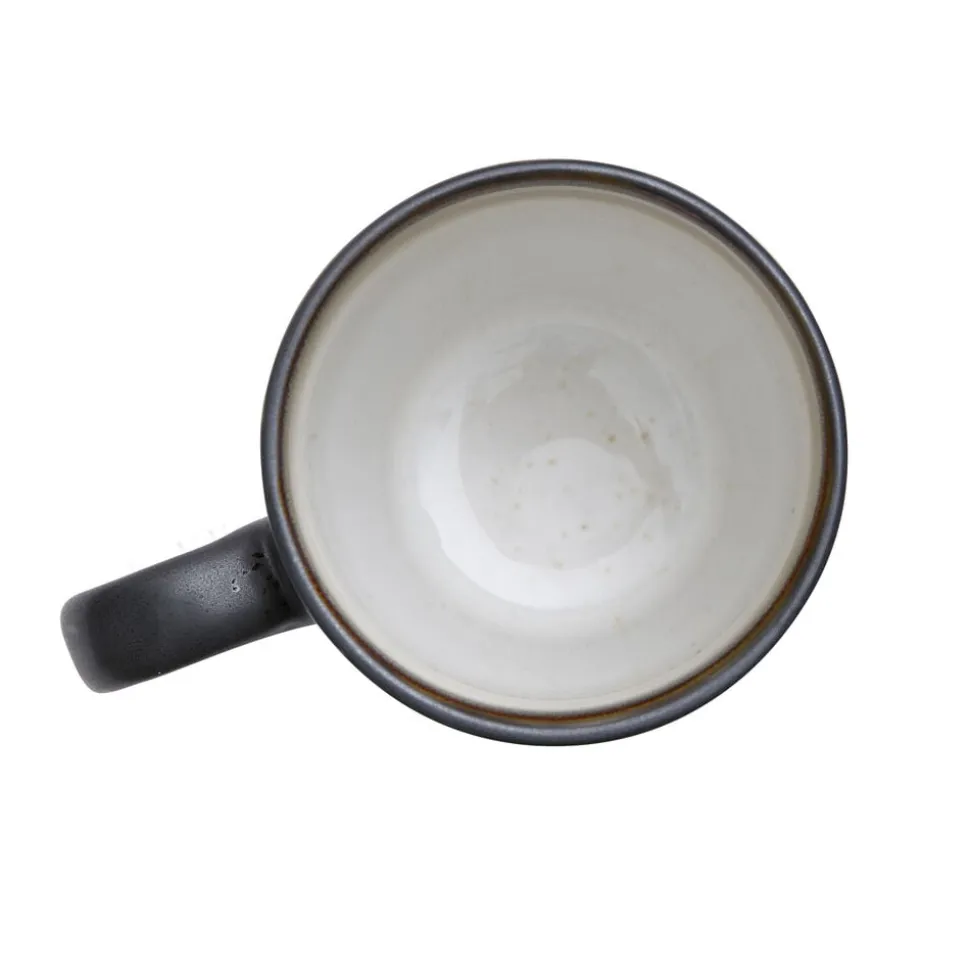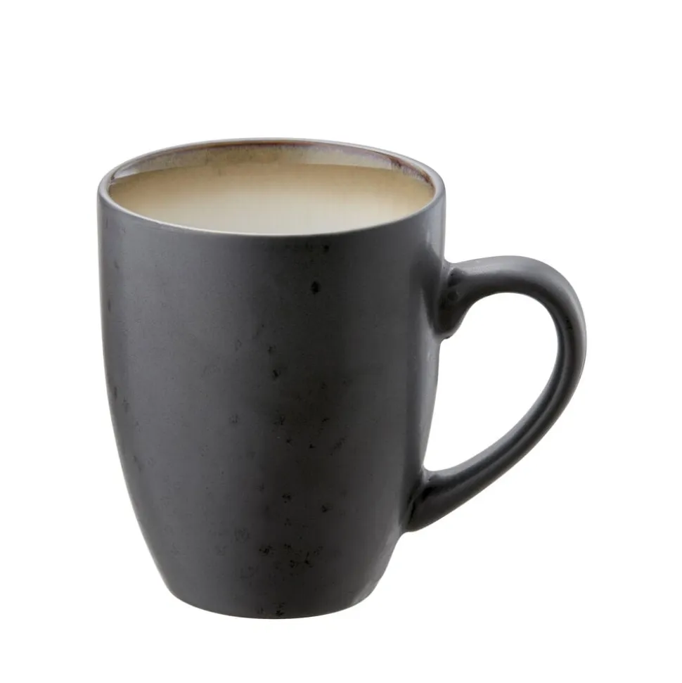 BITZ Krus m. hank fremstillet i sort stentøj. Mat sort udenpå og assorteret amber, lilla, lyserød og cremefarvet indeni.
