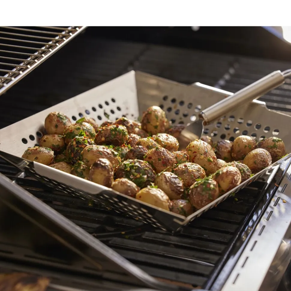 Grillbakken er ideel til grillning af skårne grøntsager, frugt eller kød og til tilberedning af varme kastanjer. Lavet af perforeret rustfri stålplade til direkte varmeoverførsel til den mad, der skal grilles. To håndtag giver et sikkert greb med grillhandsker. Til brug på grillen og i ovnen.