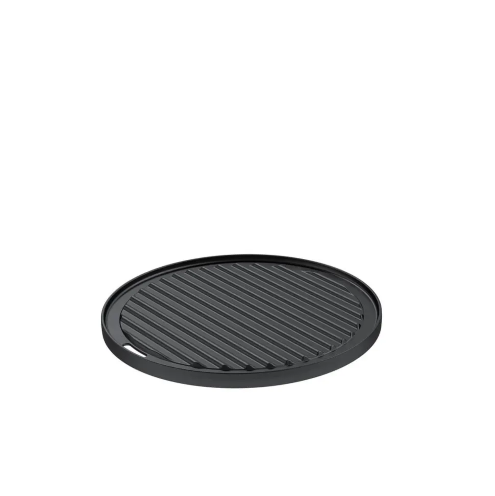 Grillpladen har kan anvendes på begge sider, den ene side er glat, og den anden er rillet. Den rillede side sikrer perfekte grillmærker på dit kød, mens den glatte side er til tilberedning af små stykker mad, der skal steges, såsom rejer, grøntsager osv. Også ideel til meget fede typer kød som andebryst, da fedtet holdes på pladen og ikke drypper ned i flammerne.