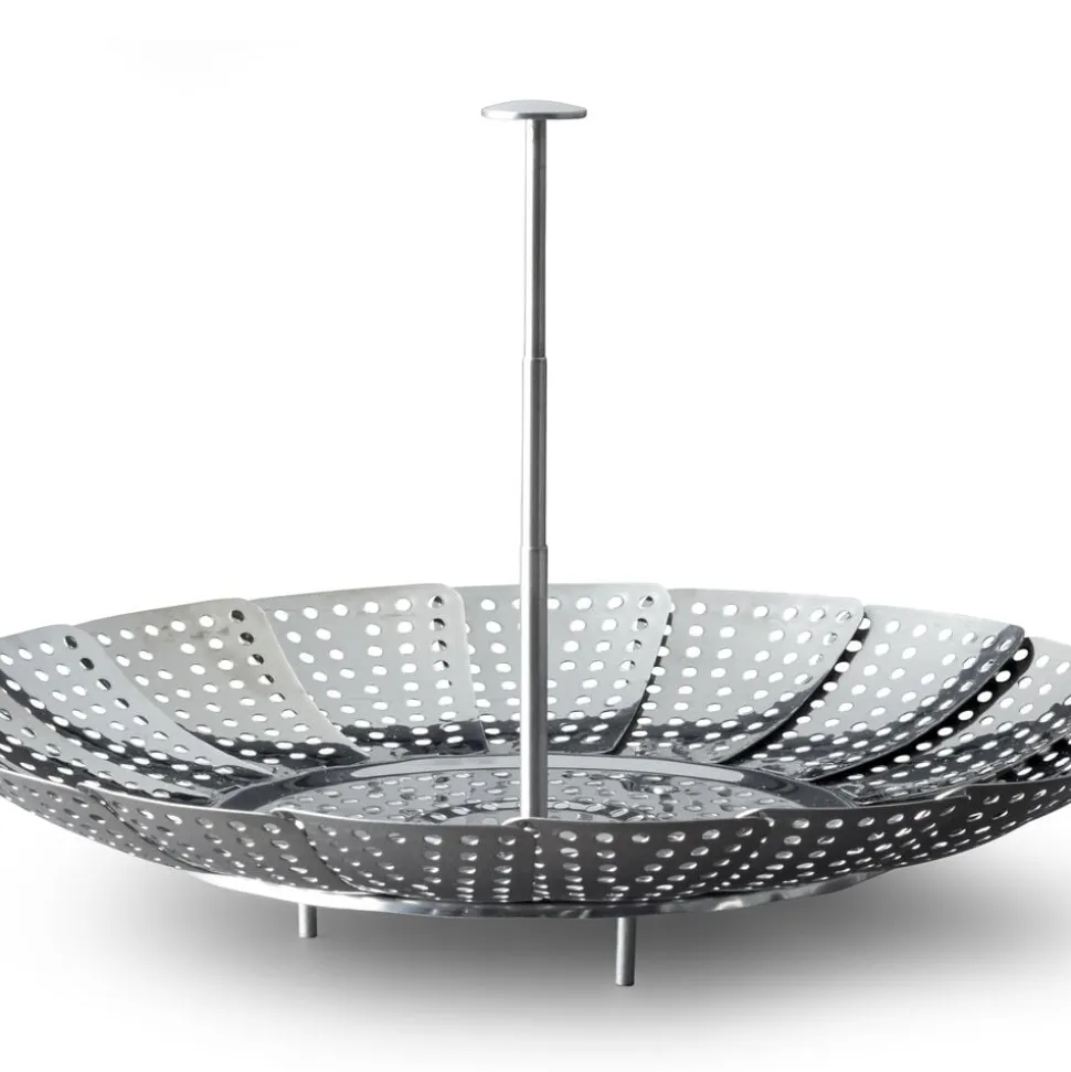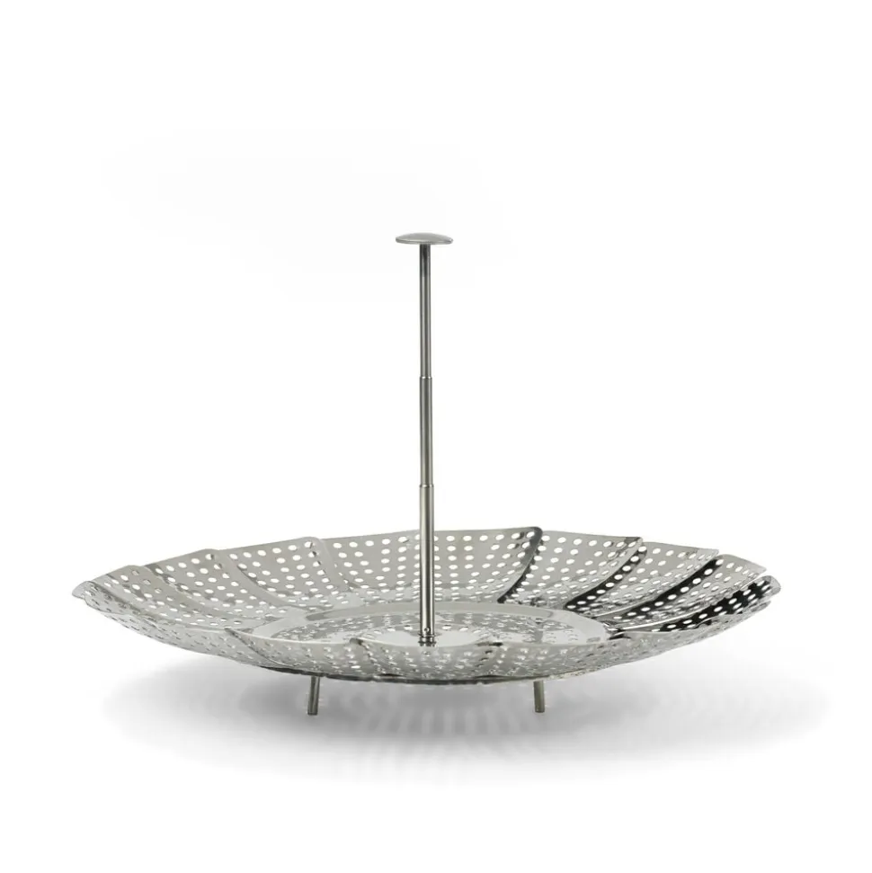Dampede grøntsager smager af mere og bevarer vitaminerne bedre. Dampindsatsen sættes ned i en gryde med lidt vand og er også velegnet til dampning af fisk og skaldyr. Dia. 23 cm, rustfrit stål med foldbare ben og teleskophåndtag.
