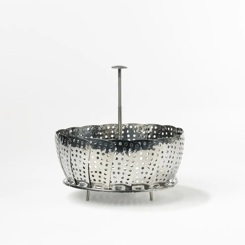 Dampede grøntsager smager af mere og bevarer vitaminerne bedre. Dampindsatsen sættes ned i en gryde med lidt vand og er også velegnet til dampning af fisk og skaldyr. Dia. 28 cm, rustfrit stål med foldbare ben og teleskophåndtag.