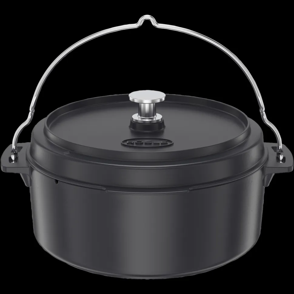 Låget kan også bruges som en pande. Med bærehåndtaget i rustfrit stål kan gryden også hænges i et bålstativ over et bål.