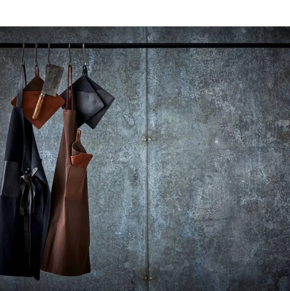 2 brune grydelapper af kanvas og læder. Kanvas er 100 % bomuldsstof i en kraftig vævning. Det er slidstærkt og vandafvisende, hvilket gør det egnet til hverdagsbrug. Læderet er 100 % bøffellæder. Bøffellæder er slidstærkt og har stor elasticitet. Med passende pleje vil bøffellæder holde i lang tid og få patina, som fremhæver læderets skønhed. Grydelapperne har en lomme, der gør det nemt at gribe fat i fade m.m. De beskytter hele hånden, fx når du tager et varmt fad ud af ovnen.