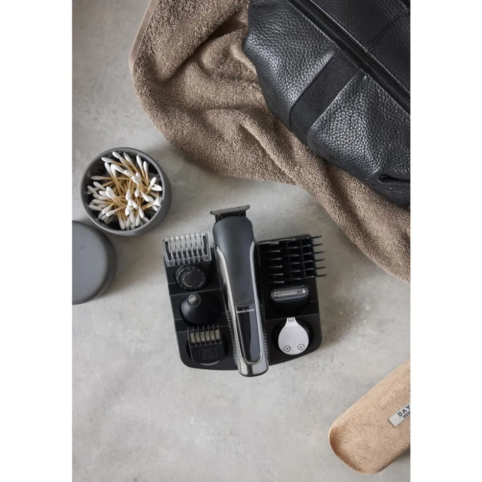 Denne hårtrimmer tilbyder et bredt udvalg af funktioner til både trimning og barbering af hår og skæg. Trimmeren har et display, der viser både brugstid og batteriniveau, så du altid er opdateret på enhedens tilstand. Der medfølger forskellige påsætningskamme (12, 9, 6, og 3 mm) samt en justerbar kam, der spænder fra 1–9 mm, hvilket giver mulighed for at vælge forskellige længder og stilarter. T- og U-formede knive som sammen med en shaver-funktion, tilbyder en grundig og tæt barbering. Næsetrimmeren gør det nemt at fjerne uønskede hår i næsen. Trimmeren har en brugstid på 80 minutter på en fuld opladning, og kan nemt oplades via det medfølgende USB-kabel. Tilbehørsdele kan opbevares pænt og praktisk i den medfølgende opbevaringsstation. Nem vedligeholdelse med rengøringsbørste.